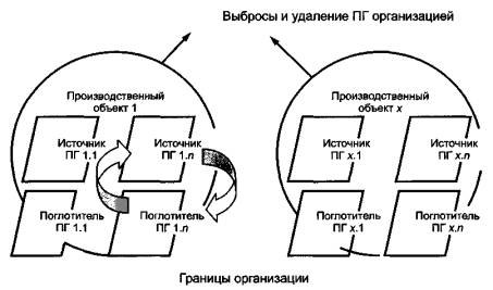 Рисунок 2 - Взаимосвязь между источниками, поглотителями ПГ и производственными объектами Организация должна консолидировать выбросы и удаление ПГ на производственных объектах с помощью одного из следующих подходов: а) управление: организация отвечает за все количественно определенные выбросы и/или удаление ПГ с производственного объекта, которыми она управляет финансовым или операционным образом; б) распределенная доля (в акционерном капитале): организация отвечает за свою долю выбросов и/или удаления ПГ с производственных объектов. Организация может использовать иной консолидированный метод в тех случаях, когда конкретные условия определены программой по ПГ или в контрактах. Организация должна задокументировать выбор применяемого метода консолидации. Организация должна объяснить любые изменения в выбранном методе консолидации. Руководство по применению подходов, основанных на управлении и распределенной доле в акционерном капитале, для консолидации выбросов и удаления ПГ с производственных объектов на организационном уровне приведено в приложении А. х - число производственных объектов, входящих в одну организацию; п - число источников или поглотителей ПГ на производственном объекте. Примечание 1 - Выбросы и удаление ПГ организацией определяют путем суммирования количественных оценок для источников и поглотителей ПГ. Примечание 2 - Поглотители ПГ со временем могут стать источниками ПГ и наоборот. 4.2 Операционные границы4.2.1 Установление операционных границ Организация должна установить и задокументировать свои операционные границы. Установление операционных границ включает в себя выявление выбросов и удалений ПГ, связанных с деятельностью организации, разделение выбросов и удаления ПГ на такие категории, как прямые, косвенные энергетические и другие косвенные выбросы, а также предполагает выбор того, какие из других косвенных выбросов должны быть количественно определены и включены в отчеты. Организация должна предоставлять полную информацию об изменениях операционных границ. 4.2.2 Прямые выбросы и удаление парниковых газов Организация должна определять количество прямых выбросов ПГ с установок в рамках своих операционных границ. Организация должна определять количество удаленных ПГ с производственных объектов в рамках своих операционных границ. О прямых выбросах ПГ, возникающих в связи с использованием электричества, тепла и пара, произведенных и экспортированных или распределенных организацией, допускается предоставлять отдельные отчеты, но они не должны вычитаться из суммы прямых выбросов ПГ организации. Примечание - Термин «экспортированный» относится к электричеству, теплу или пару, поставляемым организацией. Количество выбросов СО2 в процессе сжигания биомассы следует определять отдельно. 4.2.3 Косвенные энергетические выбросы парниковых газов Организация должна определять количество косвенных выбросов ПГ в результате производства импортированного электричества, тепла или пара, потребляемых организацией. Примечание - Термин «импортированный» относится к электричеству, теплу или пару, поставляемым из источников, находящихся за пределами границ организации. 4.2.4 Косвенные выбросы парниковых газов Организация может определять количество косвенных выбросов ПГ на основе требовани