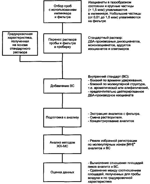 Рисунок 1 - Основные этапы метода Количественное определение и качественные оценки могут быть выполнены методами ЖХ в сочетании с масс-спектрометрией (МС) или тандемной масс-спектрометрией (МС/МС) по различным методикам. ЖХ-ХЛД (хемилюминесцентный детектор) или для ароматических изоцианатов ЖХ-УФД (ультрафиолетовый детектор) используют для определения высоких концентраций изоцианатов. Количественный анализ образцов сравнения может быть проведен с помощью ЖХ-ХЛД. Для определения летучих соединений также может быть использован газохроматографический термоионный детектор (ГХ-ТИД). 4 Реактивы и материалы4.1 Реагент ДБА Серийно выпускаемый ди-н-бутиламин класса ч. д. а. 4.2 Растворители Растворитель для реагента, как правило, толуол, и другие растворители - ацетонитрил, изооктан и метанол - должны быть класса ч. для жидкостной хроматографии. 4.3 Концентрированная муравьиная кислота, класса ч. д. а. 4.4 Концентрированная уксусная кислота, класса ч. д. а. 4.5 Раствор реагента В мерной колбе вместимостью 1 л растворяют 1,69 мл ДБА в толуоле и доводят объем раствора до метки. Раствор стабилен, и при хранении необязательно принимать специальные меры. 4.6 Раствор реагента для отбора проб без растворителя 4.6.1 Раствор ДБА 1 концентрацией 0,74 моль/л Смешивают 80 мл метанола и 12,5 мл ДБА в мерной колбе вместимостью 100 мл. При помешивании постепенно добавляют в колбу 4,16 мл уксусной кислоты. Затем добавляют в колбу метанол и доводят им объем раствора до метки. 4.6.2 Раствор ДБА 2 концентрацией 1,5 моль/л Смешивают 60 мл метанола и 25 мл ДБА в мерной колбе вместимостью 100 мл. При помешивании постепенно добавляют в колбу 8,32 мл уксусной кислоты. Затем добавляют в колбу метанол и доводят им объем раствора до метки. 4.7 Подвижные фазы для высокоэффективной жидкостной хроматографии 4.7.1 Жидкостная хроматография с масс-спектрометрическим детектированием Слабая подвижная фаза (подвижная фаза А) представляет собой смесь воды/ацетонитрила (с отношением по объему 95/5) и 0,05 % муравьиной кислоты. Сильная подвижная фаза (подвижная фаза В) представляет собой смесь воды/ацетонитрила (с отношением по объему 5/95) и 0,05 % муравьиной кислоты. Перед использованием подвижные фазы дегазируют. 4.7.2 Жидкостная хроматография с использованием хемилюминесцентного детектора Слабая подвижная фаза (подвижная фаза С) представляет собой смесь воды/метанола (с отношением по объему 95/5) и 0,05 % муравьиной кислоты. Сильная подвижная фаза (подвижная фаза D) представляет собой смесь воды/метанола (с отношением по объему 5/95) и 0,05 % муравьиной кислоты. Перед использованием подвижные фазы дегазируют. 5 Приготовление стандартных растворов5.1 Референтные соединенияРеферентные соединения необходимы для определения производных изоцианатов ЖХ-МС методом. Для серийно выпускаемых изоцианатов ДБА-производные легко приготовить путем прямой дериватизации по реакции с ДБА. ДБА-производные изоцианатов, не имеющиеся в продаже, могут быть приготовлены на основе технических изоцианатов, продуктов термической деструкции ПУ или карбамидных сополимеров, находящихся в рабочей зоне. В качестве альтернативы могут быть использованы покупные стандартные растворы. 5.2 Ди-н-бутиламиновые производные изоцианатов5.2.1 Приготовление ДБА-производных изоцианатов из серийно выпускаемых изоцианатов Многие используемые изоцианаты, та