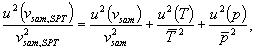 Как правило, первый член в формуле является незначительным по сравнению со вторым. 12.3.2.5 Суммарная неопределенность объема пробы Представленные выше вклады в неопределенность суммируют, и неопределенность объема пробы, приведенного к заданным условиям, вычисляют по формуле где vsam,SPT - объем отобранного воздуха, приведенный к заданным условиям;