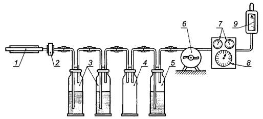 1 - подогреваемый зонд; 2 - фильтр и корпус фильтра; 3 - поглотительные сосуды с раствором NaOH концентрацией 0,1 моль/л; 4 - ловушка; 5 - поглотительный сосуд с силикагелем или осушительная трубка; 6 - насос; 7 - термометр и манометр; 8 - газовый счетчик; 9 - ротаметр Рисунок 1 - Схема системы отбора проб Примечание - Фильтр может быть расположен в газоходе или за его пределами перед первым поглотительным сосудом (см. 6.3). Все соответствующие части системы отбора проб предварительно подогревают и вставляют пробоотборный зонд в газоход таким образом, чтобы насадка находилась в первой точке отбора проб. Избегают контакта зонда с любыми отложениями на стенках газохода или порта доступа. Для сведения к минимуму натекания воздуха подсоединение к порту доступа должно быть герметичным. 7.6 Отбор проб Если отбор пробы проводят при условиях изокинетичности, то должны быть выполнены соответствующие требования ИСО 9096. Отбор проб в нескольких точках проводят в соответствии с требованиями ИСО 9096. В других случаях записывают время и текущее показание газового счетчика, затем включают насос. С помощью регулировочного клапана насоса и измерителя скорости потока устанавливают требуемую скорость потока для отбора проб. Скорость потока при отборе проб должна быть достаточной для того, чтобы в первых двух поглотительных сосудах системы отбора проб обеспечивалось интенсивное барботирование газа, но не настолько высокой, чтобы раствор переносился в третий пустой поглотительный сосуд. В каждой точке отбора проб необходимо поддерживать скорость потока постоянной (с предельно допустимым отклонением ± 10 % установленного значения). Периодически следует записывать результаты измерения температуры и давления. Если отбор проводят в двух и более точках, расположенных на одной линии, то по окончании отбора проб в одной точке пробоотборный зонд сразу же перемещают в другую точку, не выключая насос. Таким образом проводят отбор проб во всех точках, расположенных на одной линии. Если необходимо переместить зонд на другую линию, то по окончании отбора проб на одной линии закрывают регулировочный клапан насоса и выключают насос. Снимают показания газового счетчика и проводят отбор проб на второй линии, как описано выше. По окончании последнего этапа отбора проб закрывают регулировочный впускной клапан насоса и выключают насос. Снимают показания газового счетчика. После этого проводят проверку аппаратуры на герметичность. Примечание - Для обеспечения интенсивного барботирования газа может быть достаточной скорость потока от 2 до 6 л/мин. Необходимо проверять герметичность до и после отбора проб, а также при замене компонентов системы отбора проб. Скорость утечки не должна превышать 2 % от установленного значения скорости используемого газового потока. 7.8 Проверка герметичности во время отбора проб Если во время отбора проб возникает необходимость заменить компонент системы отбора проб (например, фильтр или поглотительный сосуд), то проверку утечки следует провести непосредственно перед заменой. Герметичность проверяют таким же способом, как и перед отбором проб, но проверку проводят при пониженном давлении, равном или превышающем максимальное значение, зарегистрированное перед заменой. Если скорость утечки не превышает 2 % от средней скорости при отборе про