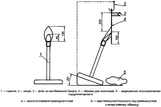 Испытательное напряжение согласно таблице 1, где Uном - номинальное напряжение, должно быть приложено между проводниками и металлической оплеткой или оболочкой со скоростью повышения не менее 100 В/с, но не более 200 В/с, и выдержано в течение 1 мин. Пробой и повреждение изоляции не допускаются. Форма волны испытательного напряжения должна быть, в основном, синусоидальной с частотой от 45 до 65 Гц. При определении Uном следует правильно использовать уровни напряжения между фазами и между фазой и нейтралью. 5.1.3 Испытание сопротивления электрической изоляции Испытание сопротивления электрической изоляции следует проводить после испытания электрической прочности изоляции по 5.1.2 на тех же испытуемых образцах. Сопротивление электрической изоляции измеряют между проводниками и внешней металлической оболочкой или специально установленной проводящей металлической лентой или оплеткой приложением напряжения (номинального) 500 В постоянного тока. Измеренное значение должно быть не менее 50 МОм. 5.1.4 Испытание на воспламеняемость Испытанию подвергают образцы всех электронагревателей, включая те, что поставляются предварительно смонтированными. Испытание проводят в комнате без сквозняков. Образец электронагревателя длиной не менее 450 мм закрепляют в вертикальном положении. Для прокладок, панелей и других распределенных электронагревателей ширина образца должна составлять 80 мм. Образец обматывают одним слоем гуммированной бумаги таким образом, чтобы она выступала на 20 мм за образец. Этот бумажный индикатор устанавливают на 250 мм выше точки контакта внутреннего голубого конуса пламени с образцом. Слой сухой чистой хирургической ваты толщиной не более 6 мм подкладывают под образец таким образом, чтобы расстояние от ваты до точки приложения пламени составляло 250 мм. Высоту пламени природного газа в горелке устанавливают на 130 мм, при этом высота внутреннего синего конуса пламени составляет 40 мм, как показано на рисунке 1а. Горелку наклоняют под углом 20° к вертикальной оси, а пламя направляют на кабель таким образом, чтобы конец внутреннего голубого конуса пламени касался образца в точке примерно на 150 мм выше его нижнего конца. Пламя подводят к электронагревателю таким образом, чтобы вертикальная плоскость, на которой находится главная ось трубки горелки, располагалась под прямым углом к плоскости испытуемого образца, как показано на рисунке 1b. Пламя воздействует на образец в течение 15 с, затем его удаляют на 15 с и весь цикл повторяют пять раз.