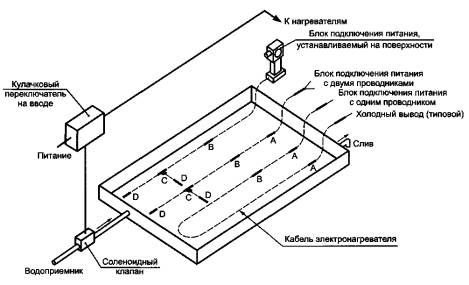 А - встроенный соединитель питания; В - встроенное соединение холодной пайкой; С - встроенный тройник; D - встроенное концевое устройство Рисунок 4 - Испытание встроенных компонентов на влагостойкость 5.1.10 Проверка номинальной выходной мощности Номинальную выходную мощность нагревательного кабеля или нагревательной панели/прокладки следует проверять одним из двух следующих методов по выбору изготовителя: а) метод сопротивления. Удельное сопротивление постоянному току при заданной температуре должно быть в пределах допусков, указанных изготовителем; b) термический метод. Для измерения тепловой мощности нагревательных кабелей образец нагревательного кабеля длиной 3-6 м размещают на трубе из углеродистой стали диаметром не менее 50 мм, как показано на рисунке 5. Образец размещают согласно инструкциям изготовителя. Испытательный аппарат полностью покрыт теплоизоляцией толщиной 25 мм. Для прокладок или нагревательных панелей испытание проводят на плоской металлической пластине с жидкостным охлаждением и изоляцией толщиной 25 мм, нанесенной поверх нагревательной прокладки или панели. Теплообменную жидкость направляют через трубопровод со скоростью, достаточной для установления турбулентного потока таким образом, чтобы разница температур жидкости и трубопровода была пренебрежимо мала. Поддерживают постоянной температуру теплообменной жидкости. Контроль осуществляют термопарами на входе и выходе трубопровода. Скорость потока должна быть такой, чтобы температура жидкости между концами трубопровода не различалась более чем на 2 К. Тепловую мощность нагревательного кабеля измеряют при трех значениях температуры трубопровода, являющихся представительными для всего рабочего диапазона. На нагревательный кабель подают номинальное напряжение, затем позволяют кабелю достичь состояния стабилизации температуры. Напряжение, ток и температуру жидкости, а также длину образца регистрируют для каждого значения температуры испытания. Три измерения выполняют на трех испытуемых образцах. Полученные результаты должны быть в пределах допусков, указанных изготовителем.