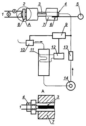 1 - источник регулируемого напряжения; 2 - см. узел А; 3 - резистивный распределенный электронагреватель; 4 - испытательная труба с внешним диаметром 50 мм или более; 5 - температурный индикатор; 6 - термопара; 7 - изоляция из стекловолокна минимальной толщиной 25 мм и плотностью примерно 3,25 кг на куб. м; 8 - электрические выводы; 9 - регулятор температуры; 10 - подключенный нагреватель; 11 - теплообменник; 12 - охладитель; 13 - расходомер; 14 - насос Рисунок 5 - Проверка номинальной выходной мощности 5.1.11 Термостойкость электроизоляционного материала Термостойкость