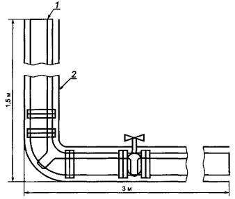 тока для кабелей с номинальным напряжением свыше 30 В переменного тока или до 5.1.12 Требования к тепловой безопасности Во взрывоопасной газовой среде должна быть обеспечена максимальная температура поверхности электронагревателя ниже нижнего предела температуры воспламенения взрывоопасной среды. Система обеспечения качества изготовителя должна подтверждать тепловую безопасность распределенных электронагревателей в течение длительного времени. 5.1.13 Определение максимальной температуры оболочки 5.1.13.1 Общие требования Примечание - Во взрывоопасной газовой среде должна быть обеспечена максимальная температура оболочки распределенных электронагревателей ниже нижнего предела температуры воспламенения взрывоопасной газовой среды. Максимальная температура оболочки зависит от удельной мощности нагревателя, коэффициента теплопередачи и максимально возможной температуры нагреваемой поверхности. Эти факторы изготовитель использует для определения температуры оболочки резистивных распределенных электронагревателей. Для обеспечения безопасной эксплуатации резистивных распределенных электронагревателей определяют максимальную температуру нагрева их оболочки, которая не должна превышать значений температуры соответствующего температурного класса для материала изделия, материала распределенного электронагревателя и теплоизоляции. Максимально допустимая удельная мощность и температура оболочки, заявленные изготовителем, должны быть испытаны одним из двух следующих методов: a) на основе системного подхода (см. 5.1.13.2), применяемого для подтверждения методологии проектирования и расчетов, использованной изготовителем, распределенный электронагреватель подвергают испытанию, во время которого изготовитель демонстрирует способность рассчитывать и прогнозировать температуры оболочки с помощью проведения специальных испытаний; b) классификацией изделия (см. 5.1.13.3), согласно которой максимальные температуры оболочки имеют место в искусственной среде, моделирующей наихудшие условия эксплуатации. 5.1.13.2 Системный подход или метод проверки конструкции 5.1.13.2.1 Для электронагревателей испытательный аппарат (см. рисунок 6) состоит из горизонтального трубопровода длиной 3 м, вертикального трубопровода длиной 1,5 м диаметром от 50 до 150 мм. В центре горизонтального отрезка устанавливают фланцевую или подобную задвижку (поворотную заслонку, проходной запорный вентиль и т.д.). Вертикальный отрезок трубопровода устанавливают таким образом, чтобы концы трубы с фланцами находились в центре. Электронагреватель устанавливают согласно инструкциям изготовителя. Для контроля температуры поверхности трубопровода и задвижки, а также температуры оболочки распределенного электронагревателя используют термопары. Термопары устанавливают на предполагаемых участках местного перегрева. Трубопровод изолируют теплоизоляцией минимальной толщиной 25 мм и устанавливают в соответствии с инструкциями изготовителя. На концах трубопровода устанавливают заглушки и теплоизоляцию. Если не указана более высокая температура, температура окружающей среды не должна превышать 40 °С. Питание резистивного распределенного электронагревателя должно составлять 110 % номинального напряжения. После стабилизации температуры системы следуе