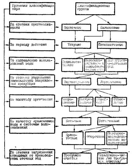 Рис. 3.1. Классификация норм водопотребления и водоотведения в промышленности Оценочная норма водопотребления и водоотведения является нормой второго уровня прогрессивности. Оценочные нормы разрабатываются с учетом лучших достижений отечественных и зарубежных предприятий по совершенствованию технологических процессов, оборудования, систем водоснабжении и канализации, а такие с учетом природных факторов, т.е. являются нормами научно-технической революции /НТР/ использования водных ресурсов. Главной задачей оценочных норм является стимулирование рационального использования производственных, природных и водных ресурсов с учетом водообеспеченности источника водоснабжения. Оценочные нормы предназначены для: - разработки планирующими органами /Госпланом, министерствами/ заданий министерствам, объединениям, предприятиям по сокращению недопотребления и водоотведения; - оценки хозяйственной деятельности министерств и ведомств СССР /объединений, предприятий/; - разработки перспективных норм водопотребления и водоотведения; - оценки проектов промышленных объектов с учетом рационального использования водных ресурсов. 3.1.8. По периоду действия нормы подразделяются на текущие и перспективные. Текущие - нормы, действующие в данных конкретных производственных условиях. Разрабатываются для предприятий, объединений и отрасли в целом. Предназначены для целей текущего планирования, для определения плановой потребности в воде, разработки водных балансов, а также контроля за использованием воды в отдельных звеньях промышленного производства. Текущие нормы действуют с момента их установления до изменения условий производства, влияющих на величину норм. С изменением условий производства текущие нормы должны быть пересмотрены. Текущие нормы разрабатываются исходя из потребности производства в воде в весенний и осенний периоды и корректируются в зависимости от сезонного характера потребления воды [7]. При пересмотре текущих норм в течение календарного года определяется среднегодовая норма водопотребления /водоотведения/. Перспективными называют нормы, устанавливаемые на перспективный период, разрабатываемые с учетом перспективного плана мероприятий в области дальнейшего совершенствования технологических процессов, применяемого оборудования, систем водоснабжения и канализации, качества используемой и отводимой воды в перспективном периоде. Эти нормы предназначаются для прогноза водопотребления и водоотведения по предприятиям, объединениям и отраслям промышленности, используются при проектировании систем водоснабжения и канализации предприятий, объединений, при составлении схем и технико-экономического обоснования по комплексному использованию водных ресурсов, для развития и размещения отраслей промышленности. Текущие нормы и нормативы определяются по двум уровням прогрессивности - балансовому и оценочному. Для перспективных норм и нормативов оценочный уровень прогрессивности не определяется. Индивидуальная перспективная норма является оценочной нормой на соответствующую перспективу и используется для ТЭО проектируемых объектов, вводимых в строй в данном перспективном периоде. 3.1.9. По направлению использования воды нормы подразделяются на технологические, нормы потребления воды вспомогатель