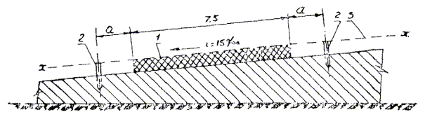 Рис. 3. Пример установки нивелирных реек при односкатном поперечном профиле: 1 - покрытие (основание); 2 - нивелирные рейки; 3 - общая плоскость X - X, проходящая через поверхность покрытия и головки нивелирных реек; а - расстояние нивелирной рейки от кромки покрытия (основания) В зависимости от производственных условий уровень установки нивелирных реек можно повысить или понизить, но при соблюдении следующих условий: линия, соединяющая вершины двух противоположных нивелирных реек на поперечнике, должна быть параллельна линии, соединяющей кромки покрытия (основания); изменение уровня должно быть одинаковым для всего участка установки струн. Пример. Ширина односкатного покрытия 7,5 м, поперечный уклон 15 ‰, отметки кромок покрытия: нижней - 100520, верхней - 100632, расстояние нивелирных реек от кромки покрытия а = 3,45 м. По табл. 1 превышение для расстояния 3,45 м и поперечного уклона 15 ‰ равно 52 мм. Отметки нивелирных реек будут равны: нижней 100520 - 52 = 100468; верхней 100632 + 52 = 100684. Вычисленные отметки нивелирных реек сводят в таблицу. По этим отметкам под нивелир устанавливают все нивелирные рейки. Установка стоек с кронштейнами Стойки представляют собой металлические, стержни, на которые надевают струбцины с кронштейнами. Струбцины имеют два отверстия (одно для стойки, другое для кронштейна) и два зажимных винта. На конце кронштейна имеется прорезь для струны. Перед установкой стоек производят их сборку. На стойки надевают струбцины с кронштейнами прорезями вверх. Струбцины опускают от верха стоек на 15 см, а кронштейны выдвигают из струбцин на 30 см. В таком положении струбцину закрепляют на оба винта. На кронштейнах необходимо проверить прорези, если есть заусеницы и острые края, то их необходимо отшлифовать. Затем стойки аккуратно погружают на автомобиль, вывозят на трассу и раскладывают около нивелирных реек по всей длине участка. На аэродромах стойки удобно устанавливать по оси рядов. Работы ведут в таком порядке (см. рис. 1). Стойку отодвигают от нивелирной рейки во внешнюю сторону на 30 см, ставят вертикально (кронштейн должен быть обращен к нивелирной рейке) и забивают в землю так, чтобы она стояла вертикально и прочно. Устанавливают теодолит в начале участка так, чтобы его визирная ось была совмещена со створом нивелирных реек. Винты струбцины ослабляют и передвижением струбцины по стойке, а кронштейна в струбцине устанавливают кронштейн строго перпендикулярно к линии натяжения струны, чтобы прорезь находилась точно над нивелирной рейкой и на 8 мм выше принятой высоты установки струн над рейками. Необходимо следить за тем, чтобы не было перекосов кронштейна (чтобы острые края прорезей не резали струну). Высоту прорези над рейкой измеряют линейкой (шаблоном), а совмещение прорезей со створом нивелирных реек проверяют по теодолиту. В таком положении струбцины временно закрепляют на оба винта. При установке стоек на затвердевшем цементобетонном покрытии (пескоцементном основании) возникает необходимость сверления отверстий. Для облегчения работы эти отверстия устраивают заранее в свежеуложенном бетоне (пескоцементе). Для этого используют раму трубного финишера или специального передвижного мостика, перемещающегося в потоке машин вслед за трубным финишером. По оси ряда штырем делают отверстия глубиной 20 см, в которое вставляют рубероидн