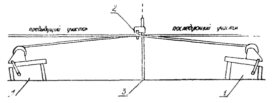 Рис. 4. Натяжение струн: 1 - натяжной барабан; 2 - кронштейн; 3 - металлическая стойка После того, как струну натянули, окончательно выправляют ее в плане и по высоте. Для того, чтобы струна проходила на одинаковой высоте от нивелирных реек, установленных под отметку, производят выправку копирной струны в продольном профиле с помощью деревянного шаблона (линейки). Шаблон устанавливают вертикально на нивелирную рейку и, ослабляя зажимной винт, перемещают струбцину вдоль стойки на высоту шаблона и устанавливают ее таким образом, чтобы кронштейн упирался в шаблон. После чего струбцину закрепляют в этом положении. После выправки струны в продольном профиле производят выправку струны в плане по теодолиту. После окончательной выверки положения струны струбцину закрепляют на оба винта. Не рекомендуется натягивать вставленную в прорези струну. Это может привести к перекосу кронштейнов и обрыву струны. При обрывах струну снимают, отпускают запас струны, оборванные концы связывают и струну снова натягивают и вставляют в прорези. Узел струны не окажет влияния на ровность покрытия. Важно, чтобы он прочно соединял струны. После окончания работ по устройству основания или покрытия струны снимают. Для этого ослабляют натяжение струны, вынимают струну из прорезей и наматывают на специальную намоточную катушку. Вытаскивают стойки, очищают их, все оборудование погружают на автомобиль и перевозят на новый участок работы. Контроль качества установки копирных струн Контроль качества установки струн должен осуществляться по всем элементам процесса: установка нивелирных реек; установка стоек; натяжение струн. При контроле правильности установки нивелирных реек следует прежде всего оценить, на достаточном ли расстоянии от покрытия они установлены, чтобы не мешать работе машин. Затем проверяют положение нивелирных реек в плане: рейки одной линии должны находиться строго в створе этой линии, быть на одинаковом расстоянии от оси ряда. Отметки нивелирных реек проверяют контрольной нивелировкой сразу же после их установки. Стойки должны стоять вертикально и прочно так, чтобы они не качались. Прорези для струн на кронштейнах должны находиться точно над нивелирными рейками, кронштейны не должны иметь перекосов. Прорези для струны в кронштейнах не должны иметь острых краев и зазубрин. Струна должна быть натянута так, чтобы ее провисание было почти незаметным. Высота струны над нивелирными рейками должна быть одинаковой. Особые способы установки копирных струн В предыдущих разделах были описаны наиболее распространенные и наиболее рациональные способы и приемы установки струн. Эти способы обеспечивают ритмичную работу машин всего комплекта при переходе с одного участка установки струн на другой без какой-либо остановки машин для переналадки и настройки датчиков. Иногда по условиям местности применение этих способов либо невозможно, либо сопряжено с большими трудностями. В этих случаях применяют другие - особые способы установки струн. Применение этих способов обязательно повлечет за собой переналадку датчиков на новые условия, а это вызовет необходимость остановки машин, т.е. нарушение ритмичности потока. Кроме того, после переналадки датчиков потребуется некоторая дорегулировка рабочих органов машин. Поэтому применение этих способо