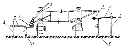Рис. 5. Установка копирных струн в разных уровнях: 1 - металлическая стойка; 2 - кронштейн; 3 - датчик уровня с копиром; 4 - нивелирная рейка; 5 - рама профилировщика; h1 - постоянная высота левой струны; h2 - постоянная высота правой струны В этом случае при переходе машин на этот участок для каждой струны должно быть изменено положение укосин с датчиками и датчики настроены на новые уровни - правые датчики настроены на уровень правой струны, левые - на уровень левой струны. При таком способе установки струн важно, чтобы высота каждой струны над нивелирными рейками была на всем протяжении строго одинаковой. III. Установка струн на кривых с малым радиусом На кривых малых радиусов (на примыканиях рулежных дорожек к ВПП, к перронам и т.п.) расстояние между стойками сокращают до 1,5 м. При этом получают ломаную линию струны. Однако грани покрытия, уложенного бетоноукладчиком, будут очерчены по плавной кривой достаточно точно. IV. Указания по организации труда Для обеспечения успешной работы по установке струн геодезисту-руководителю звена рабочих должны заранее выдаваться ведомости нивелировочных отметок пикетных и плюсовых точек, вычисленных двойным машинным счетом. Работы по установке копирных струн выполняет звено следующего состава: Инженер геодезист 1 Дорожные рабочие: 4 разр. 1 3 разр. 1 2 разр. 2 Подсобный рабочий 1 разр. 1 Инженер-геодезист является руководителем бригады и выполняет работу с геодезическим инструментом (теодолит, нивелир, эккер). Перед началом работы он проводит осмотр участка, после чего принимает решение о способе установки струн. В конце рабочей смены делает окончательную выправку струны. В процессе работы основные обязанности рабочих распределяются в таком порядке: рабочие 4 и 3 разр. выполняют наиболее ответственную работу - провешивают линию установки струны, разметку мест установки нивелирных реек. Устанавливают нивелирные рейки под нивелир, устанавливают стойки и кронштейны под теодолит и по шаблону, делают контроль и выправку струны в плане и профиле; рабочие 2 разр. забивают стойки, работают с лентой и нивелировочными рейками, переносят геодезические инструменты по участку работ, разматывают и раскладывают струны, сматывают струну на катушку; рабочий 1 разр. выполняет, главным образом, все работы по переноске инвентаря (стоек, нивелирных реек, вешек и др.), снимает и очищает стойки и выполняет другие вспомогательные подсобные работы. При необходимости все рабочие звена участвуют в погрузке и выгрузке инвентарных принадлежностей. При перевозке имущества звену придают грузовой автомобиль. IV.