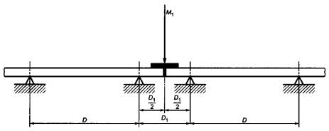 Длительность испытания должна составлять 5 мин. М = т + mL где т - масса сборной шины между опорами: mL - масса присоединительной секции и узлов ответвлений. 8.2.10.1.2 Второе испытание проводят на двух прямых секциях шинопровода, соединенных вместе и закрепленных на опорах, как при нормальной эксплуатации при минимальном количестве точек опоры, расположенных на максимальном расстоянии D и D1. Расстояние D представляет собой расстояние, определенное в 8.2.10.1.1; расстояние D1 - это максимальное расстояние между опорами, примыкающими к точке соединения, как это установлено изготовителем. Соединение должно быть расположено по центру между опорами. Массу М1 располагают без динамической нагрузки в верхней части оболочки в месте соединения на прочном элементе в форме квадрата, стороны которого равны ширине шинопровода. Масса М1 должна быть равна массе т1 секций шинопровода, включая соединение, находящейся между опорами, размещенными на расстоянии D1 плюс дополнительная масса mL1, равная максимальной нагрузке, создаваемой присоединительной секцией и узлами ответвления, определяемых изготовителем, которые присоединяются к длине D1. Длительность испытания должна составлять 5 мин.