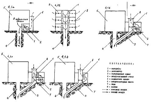 где Fк - поверхность нагрева одного калорифера, м2. При нагнетательном и комбинированном способах проветривания рудника калориферная установка компануется в одном здании с вентиляторной установкой. Калориферы целесообразно устанавливать до вентиляторов, что упрощает обогрев помещений вентиляторных установок и уменьшает потери воздуха. При всасывающем способе проветривания рудника для различных условий рекомендуется следующее решение по компановке калориферных установок: 1. Воздух подается только для проветривания ствола (ориентировочная скорость воздуха в стволе 0,15 м/с). Калориферная установка комплектуется вентиляторами и размещается в надшахтном здании, используясь одновременно для его обогрева. Подачу воздуха в рудник, учитывая его малое количество, можно осуществлять через устье ствола (рис. 4.1а). 2. Воздухоподающий ствол не имеет действующих подъемов и есть возможность использовать депрессию главной вентиляторной установки для проталкивания воздуха через калориферную установку. В данном случае калориферную установку размещают в надшахтном здании и обеспечивают одинаковое сопротивление движению воздуха по всем калориферам. Для этого целесообразно предусматривать секционирование калориферов с возможностью регулировки сопротивления воздуха по секциям. В рудник воздух подается непосредственно через устье ствола (рис. 4.1б). 3. Воздухоподающий ствол имеет клетевые подъемы с комплексом обмена вагонов в надшахтном здании. В этом случае воздух в рудник подается по калориферному каналу. Тип, конструктивные решения и расположение калориферной установки должны обеспечивать минимальный подсос воздуха из надшахтного здания и не усложнять работу по подаче материалов и оборудования к обменному комплексу ствола. Рекомендуются следующие технические решения по устройству калориферных установок, эффективность применения каждого из которых рассматривается для конкретных условий: калориферная установка с подогревом всего поступающего в рудник воздуха и вентилятором для подачи воздуха по калориферному каналу (рис. 4.1в). калориферная установка с частичным подогревом поступающего в рудник воздуха и с вентилятором для подачи воздуха по калориферному каналу (рис. 4.1г). калориферная установка с подогревом всего поступающего в рудник воздуха и с использованием общешахтной депрессии для его подачи (рис. 4.1д). При расчете возможной депрессии в надшахтном здании необходимо учитывать следующие факторы: необходимость создания максимально допустимой скорости воздуха в калориферном канале с целью снижения объема горно-капитальных работ на его проходку; сопротивление калориферного канала и шахты; сопротивление калориферов; разность давления создаваемых теплым и холодным столбами воздуха. При проектировании калориферных установок необходимо, по возможности, применять типовые проекты калориферных установок полностью или с привязкой к данным условиям. 4.6. Водоотливные установкиПри проектировании водоотливных установок необходимо решить следующие задачи: выбор схемы водоотлива; определение типа и количества насосов; расчет водоотливных трубопроводов на пропускную способность и прочность с учетом коррозийного износа и срока службы; расчет режимов работы насосов водоотливной установки; расчет экономических пок