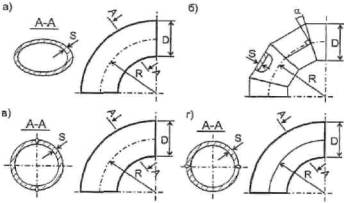 Рис. 3.1. Отводы: а - гнутый; б - секторный; в, г – штампосварной 3.2.3. Расчеты штампосварных отводов зависят от расположения сварных швов: - при расположении сварных швов в плоскости кривизны отвода (рис. 3.1,в) расчетная толщина стенки sRO = k2×sR/jy (3.6) - при расположении сварных швов по нейтральной линии (рис. 3.1,г) толщина стенки определяется как наибольшее из двух значений sRO = max(sR/jy,k2×sR) (3.7) Примечание. В формулах (3.6) и (3.7) sR определяется по формуле (3.1) при jy = 1.0, а величина k2 - по формуле (3.5). Таблица 3.2