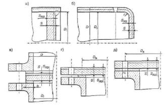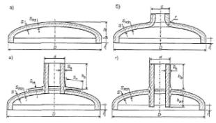 Рис. 3.4. Круглые плоские заглушки: а - внутритрубная; б - торцевая; в - межфланцевая; г, д - фланцевая 3.5.5. Расчетная толщина и допустимое давление плоской фланцевой заглушки, соответствующей рис. 3.4,г: