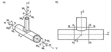 Рис. 5.2. Расчетная схема тройника (врезки): а - схема нагружения, б - расчетные сечения 5.5.9. Концентрация напряжений изгиба в тройниках зависит от безразмерного параметра Н. Для сварных не усиленных тройников, конструкция которых соответствует рис. 3.3,а:
