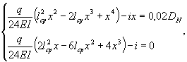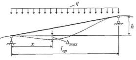 Здесь 0,02DN - допустимое значение максимального провисания в пролете, lcp - длина пролета, х - расстояние от левого конца пролета до места с максимальным прогибом,, i = h/lcp - уклон трубопровода, принимаемый согласно пункту 5.1.4 [14], DN - условный диаметр.