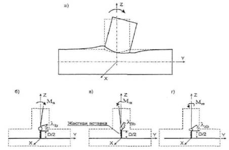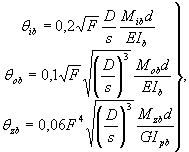 где 2. Тройники и врезки 2.1. При поверочных расчетах трубопроводных систем рекомендуется учитывать пониженную жесткость Т-образных соединений в местах примыкания ответвлений к магистрали. Нижеприведенные формула справедливы для ортогональных тройников и врезок с отношением d/D £ 0,8. Для ортогональных равнопроходных или почти равнопроходных тройников и врезок с отношением d/D > 0,8 пониженная жесткость ответвления, как правило, не учитывается. 2.2. Углы поворота ответвления (рис. п. 2.1) от приложенных к нему изгибающих моментов в плоскости тройника (врезки) Mib и в перпендикулярной ей плоскости Mob а также от крутящего момента Mzb вычисляются по формулам: Углы характеризуют жесткость ответвления в точке, где осевая линия ответвления пересекается с наружной поверхностью магистрали. В формулах (4): Ib, Ipb - моменты инерции сечения штуцера при изгибе и кручении. F = d×sh/(D×s), sh - номинальная толщина стенки ответвления. Угловые податливости (величины, обратные жесткостям) соединения ответвления с магистралью рассчитываются по формулам Примечания: 1. При наличии усиливающей накладки в формулы (4) и (5) вместо s подставляется s + sn, где sn - толщина накладки. 2. В штампованных и штампосварных тройниках d и sh принимаются равными соответственно диаметру и толщине стенки ответвления (не горловины).