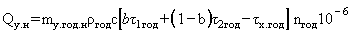 где rгод - среднегодовая плотность теплоносителя при средней (с учетом b) температуре теплоносителя в подающем и обратном трубопроводах тепловой сети, кг/м3; b - доля массового расхода теплоносителя, теряемого подающим трубопроводом тепловой сети (при отсутствии данных можно принимать от 0,5 до 0,75); t1 год и t2 год - среднегодовые значения температуры теплоносителя в подающем и обратном трубопроводах тепловой сети по температурному графику регулирования тепловой нагрузки, °С; tх год - среднегодовое значение температуры исходной воды, подаваемой на источник теплоснабжения и используемой для подпитки тепловой сети, °С; с - удельная теплоемкость теплоносителя, ккал/кг °С.