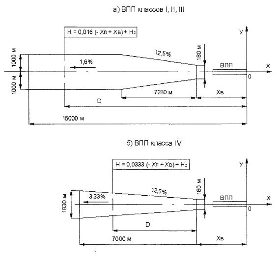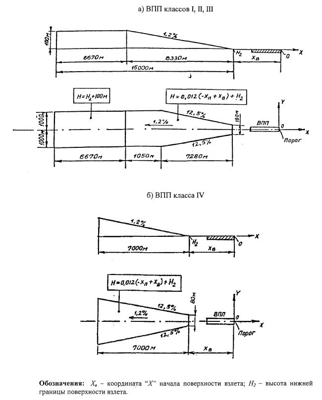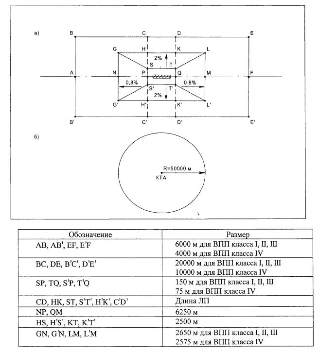 Глава III. Физические характеристики аэродромов3.1. Располагаемые дистанции для взлета и посадки3.1.1. На аэродроме для каждого направления взлета и посадки должны быть установлены следующие располагаемые дистанции: располагаемая дистанция разбега; располагаемая дистанция взлета; располагаемая дистанция прерванного взлета; располагаемая посадочная дистанция. 3.2. Геометрические размеры элементов аэродрома3.2.1. Ширина ИВПП должна быть по всей длине постоянной и не менее: 60 м - для аэродромов класса I; 42 м - для аэродромов класса II; 32 м - для аэродромов класса III; 28 м - для аэродромов класса IV. Для аэродромов класса I минимальную ширину ИВПП допускается принимать равной 45 м. При этом должны быть предусмотрены укрепленные обочины такой ширины, чтобы расстояние от оси ИВПП до внешних кромок каждой из обочин было не менее 30 м. 3.2.2. При отсутствии РД, примыкающей к концевому участку ИВПП для разворота ВС должно предусматриваться уширение ИВПП. Ширина ИВПП в местах уширения должна быть не менее: 75 м - для аэродромов классов I, II; 45 м - для аэродромов классов III, IV. 3.2.3. Длина концевых полос безопасности (КПБ) должна быть не менее: 150 м для аэродромов классов I, II, III и 120 м для аэродромов класса IV. 3.2.4. На КПБ должны предусматриваться укрепленные участки. Ширина укрепленного участка КПБ должна быть не менее ширины ИВПП, а длина не менее: 50 м - для аэродромов класса I и II; 20 м - для аэродромов класса III и IV. 3.2.5. С каждой стороны ИВПП должны быть предусмотрены боковые полосы безопасности (БПБ). Ширина БПБ должна быть не менее: 50 м - для аэродромов класса I; 25 м - для аэродромов классов II, III и IV. 3.2.6. Продольный профиль ИВПП должен обеспечивать взаимную видимость двух точек, находящихся на высоте 3 м от поверхности ИВПП и на расстоянии менее половины ее длины. 3.2.7. Продольные и поперечные уклоны ИВПП должны быть не более приведенных в таблице 3.1. Таблица 3.1
