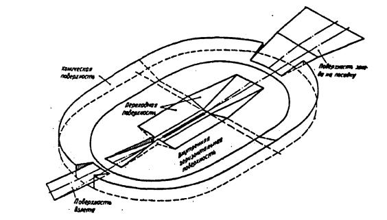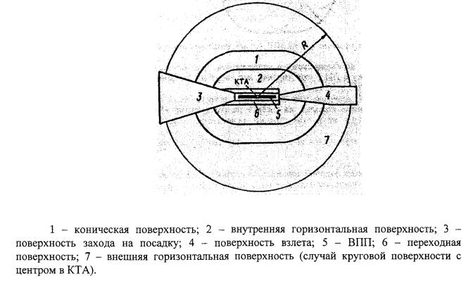 Рис. 4.1. Зоны и поверхности для выявления препятствий 4.2. Ограничение препятствийНеоборудованная ВПП и ВПП для захода на посадку по приборам 4.2.1. Для необорудованной ВПП и ВПП для захода на посадку по приборам устанавливаются следующие поверхности ограничения препятствий: внешняя горизонтальная поверхность (рисунок 4.2); коническая поверхность (рисунки 4.2, 4.3); внутренняя горизонтальная поверхность (рисунки 4.2-4.4); поверхность захода на посадку (рисунки 4.2, 4.3); переходные поверхности (рисунки 4.2, 4.3). Относительные высоты, размеры и наклоны данных поверхностей указаны в таблице 4.1.