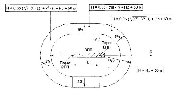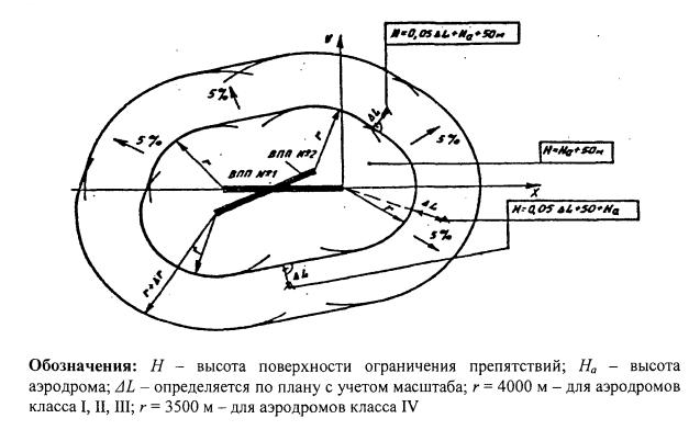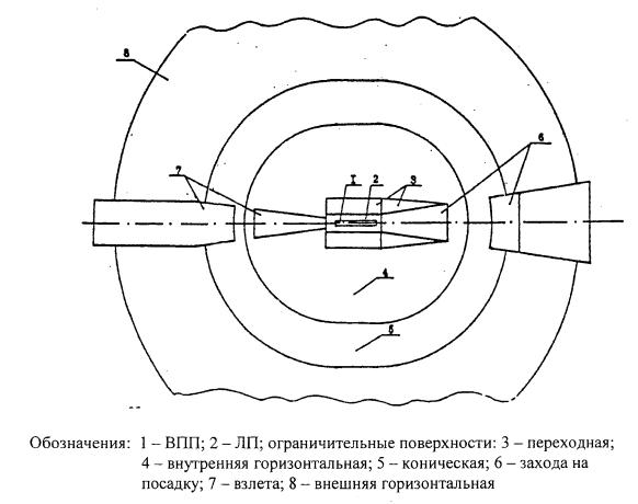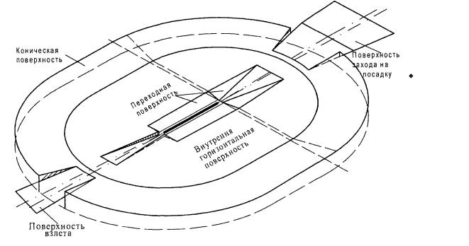 Рис. 4.4. Внутренняя горизонтальная поверхность Поверхность захода на посадку имеет: нижнюю границу установленной длины, расположенную горизонтально на заданном расстоянии перед порогом ВПП, перпендикулярно и симметрично осевой линии ВПП; две боковые границы, начинающиеся от концов внутренней границы и равномерно расходящиеся под установленным углом к продолжению осевой линии ВПП; верхнюю границу, параллельную нижней границе. Высота нижней границы поверхности захода на посадку соответствует высоте средней точки порога ВПП. Наклон поверхности захода на посадку измеряется в вертикальной плоскости, содержащей осевую линию ВПП. Переходная поверхность является контрольной поверхностью ограничения естественных и тех искусственных препятствий, которые не размещены вблизи ВПП (здания и сооружения, воздушные суда на местах стоянки, осветительные мачты и т.п.). Наклон переходной поверхности измеряется в вертикальной плоскости, перпендикулярной оси ВПП или ее продолжению. Переходная поверхность имеет: нижнюю границу, начинающуюся у пересечения боковой границы поверхности захода на посадку с внутренней горизонтальной поверхностью и продолжающуюся вниз вдоль боковой границы поверхности захода на посадку и далее на расстоянии, равном половине длины нижней границы поверхности захода на посадку; верхнюю границу, расположенную в плоскости внутренней горизонтальной поверхности. Высота нижней границы поверхности является в общем случае переменной величиной. Высота точки на этой границе равна: вдоль боковой границы поверхности захода на посадку - превышению поверхности захода на посадку в этой точке; вдоль ВПП - превышению ближайшей точки осевой линии ВПП или ее продолжения. 4.2.2. Объекты, возвышающиеся над любой из поверхностей, указанных в пункте 4.2.1 необходимо, насколько это практически возможно, устранять. ВПП точного захода на посадку I, II, III категорий внешняя горизонтальная поверхность; коническая поверхность; внутренняя горизонтальная поверхность; поверхность захода на посадку; переходные поверхности; внутренняя поверхность захода на посадку (рисунок 4.5); внутренние переходные поверхности; поверхность прерванной посадки. Относительные высоты, размеры и наклоны данных поверхностей указаны в таблице 4.1. Характеристики внешней горизонтальной поверхности, конической поверхности, внутренней горизонтальной поверхности, поверхности захода на посадку и переходной поверхности приведены в пункте 4.2.1.