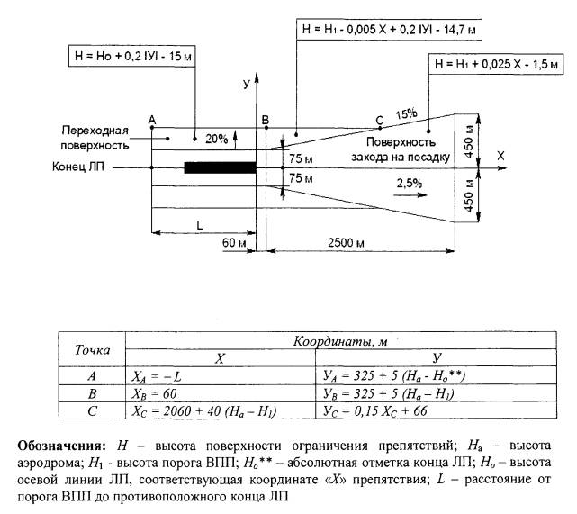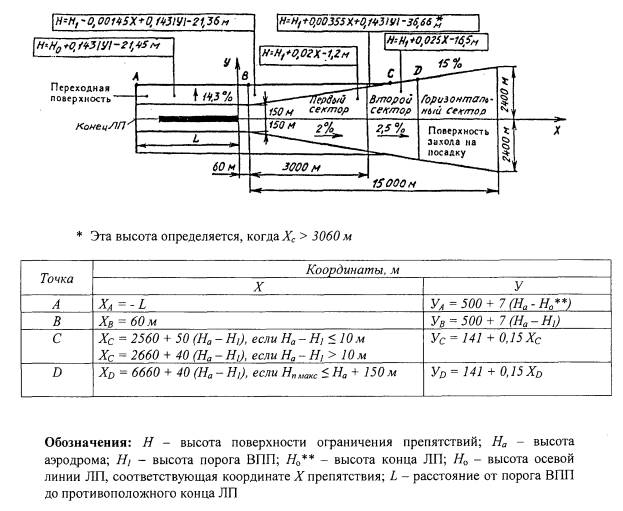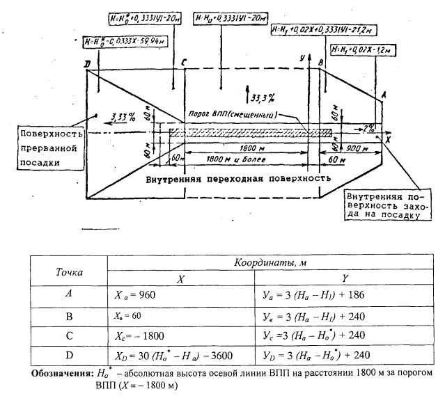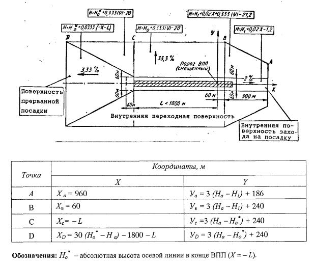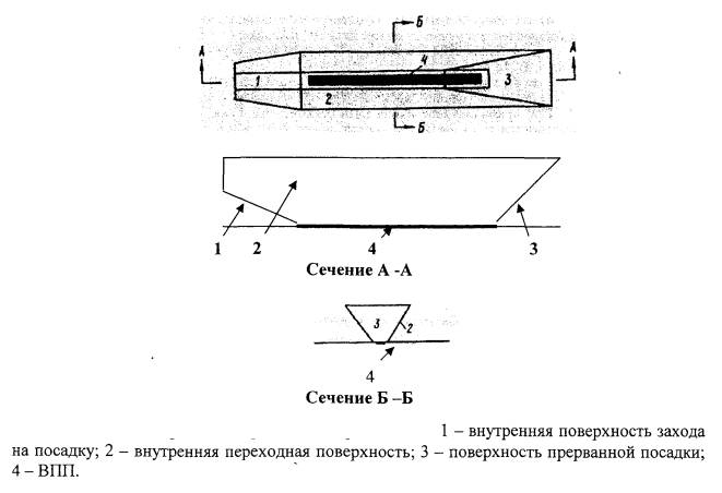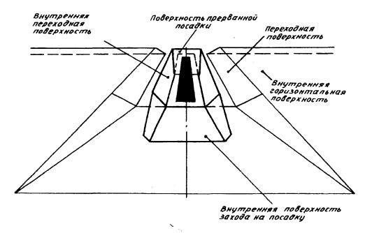Рис. 4.5. Поверхности ограничения препятствий Внутренняя поверхность захода на посадку имеет: нижнюю границу, совпадающую с нижней границей поверхности захода на посадку, но имеющую меньшую длину; две боковые границы, начинающиеся у концов нижней границы; верхнюю границу, параллельную нижней границе. Внутренняя переходная поверхность (рисунок 4.5) является контрольной поверхностью ограничения тех препятствий, которые должны располагаться вблизи ВПП (навигационные средства, метеоприборы, СДП, воздушные суда на РД и другие транспортные средства, движущиеся по установленным маршрутам). Наклон внутренней переходной поверхности измеряется в вертикальной плоскости, проходящей перпендикулярно осевой линии ВПП или ее продолжению. Внутренняя переходная поверхность имеет: нижнюю границу, начинающуюся от конца верхней границы внутренней поверхности захода на посадку и простирающуюся вдоль боковой границы этой поверхности и далее вдоль летной полосы параллельно осевой линии ВПП, а затем по боковой границе поверхности прерванной посадки до конца верхней границы этой поверхности; верхнюю границу, расположенную на высоте 60 м относительно высоты аэродрома. Высота нижней границы внутренней переходной поверхности является в общем случае переменной величиной и равна: вдоль боковой границы внутренней поверхности захода на посадку и поверхности прерванной посадки - превышению соответствующей поверхности в рассматриваемой точке; вдоль ВПП - превышению ближайшей точки на осевой линии ВПП. Часть внутренней переходной поверхности, расположенная вдоль ВПП, является криволинейной при криволинейном профиле ВПП или представляет собой плоскость при прямолинейном профиле ВПП. Верхняя граница внутренней переходной поверхности также является криволинейной или прямолинейной в зависимости от профиля ВПП. Поверхность прерванной посадки (рисунок 4.5) имеет: нижнюю границу, проходящую перпендикулярно к осевой линии ВПП на заданном расстоянии за порогом ВПП; две боковые границы, начинающиеся у концов нижней границы и равномерно расходящиеся под заданным углом от вертикальной плоскости, содержащей осевую линию ВПП; верхнюю границу, параллельную нижней границе и расположенную на высоте 60 м относительно высоты аэродрома. Высота нижней границы равняется превышению осевой линии ВПП в месте расположения нижней границы. Наклон поверхности прерванной посадки измеряется в вертикальной плоскости, содержащей осевую линию ВПП. 4.2.4. Объекты, возвышающиеся над любой из поверхностей, указанных в пункте 4.2.3 необходимо, насколько это практически возможно, устранять. Неподвижные объекты не должны выступать за внутреннюю поверхность захода на посадку, внутренние переходные поверхности и поверхность прерванной посадки, за исключением объектов на ломком основании, которые по своему функциональному назначению должны располагаться в пределах этой поверхности. При использовании ВПП для посадки над этой поверхностью не должны возвышаться подвижные объекты.