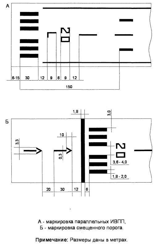 Поверхность взлета (рисунок 4.1) имеет: а) нижнюю границу установленной длины, расположенную горизонтально в конце летной полосы перпендикулярно и симметрично осевой линии ВПП; б) две боковые границы, начинающиеся у концов нижней границы и равномерно расходящиеся под установленным углом от линии пути ВС при взлете: до ширины 2000 м и затем продолжающиеся параллельно до верхней границы для ВПП классов I, II, III; до верхней границы установленной длины для ВПП класса IV; в) верхнюю границу, проходящую горизонтально и перпендикулярно указанной линии пути при взлете. При прямолинейной линии пути расхождение боковых границ и конечная ширина поверхности отсчитывается от продолжения осевой линии ВПП, а при криволинейной - от установленной в плане линии пути набора высоты после взлета. Высота нижней границы поверхности взлета равна высоте наивысшей точки местности на продолжении осевой линии ВПП в пределах от конца ВПП до конца летной полосы. При прямолинейной поверхности взлета наклон поверхности взлета измеряется в вертикальной плоскости, содержащей осевую линию ВПП. При криволинейной поверхности взлета наклон поверхности взлета измеряется в вертикальной поверхности, содержащей установленную линию пути ВС при взлете. 4.2.6. Объекты, возвышающиеся над поверхностью взлета, рекомендуется устранять. 4.3. Учет препятствий при взлете и посадке4.3.1. Учет препятствий при взлете. Препятствия, расположенные в пределах границ поверхности взлета в соответствии с пунктом 4.2.5 настоящих Норм и превышающие поверхность с наклоном 1,2% или высоту 100 м относительно уровня нижней границы поверхности взлета (в зависимости от того, что меньше), включаются в ИПП, с указанием о необходимости их учета при определении максимальной взлетной массы воздушного судна. При расчете безопасных высот пролета препятствий должны учитываться все препятствия, расположенные в зонах учета препятствий в соответствии с п. 4.1.2 настоящих Норм, предусмотренных для соответствующей радиотехнической системы посадки. Безопасные высоты пролета препятствий устанавливаются для каждого направления посадки и указываются в ИПП. Глава V. Маркировка аэродромных покрытий, препятствий и объектов. Светоограждение препятствий и объектов5.1. Маркировка покрытий ИВПП5.1.1. На ИВПП аэродромов наносятся следующие маркировочные знаки (рисунки 5.1, 5.2): порога, продольной оси полосы, зоны фиксированного расстояния, зоны приземления, линии выхода с ИВПП на РД на участке сопряжения РД с ИВПП и цифровые знаки посадочного магнитного путевого угла (далее - ПМПУ). 5.1.2 Расположение маркировочных знаков на ИВПП, их размеры и количество должны соответствовать таблице 5.1. Цифровые знаки ПМПУ и знаки обозначения параллельных ВПП должны располагаться в соответствии с рисунками 5.1, 5.2. 5.1.3. Параллельные ИВПП дополнительно со стороны захода на посадку маркируются латинскими буквами "L" (левая) и "R" (правая), которые располагаются между знаками порога и цифровыми знаками ПМТУ. Цифровые знаки ПМПУ и знаки обозначения параллельных ИВПП должны располагаться согласно рисунку 5.2. 5.1.4. Маркировка осевой линии ИВПП наносится по продольной оси ИВПП. 5.1.5. Линия выхода с ИВПП на РД на участке сопряжения РД с ИВПП должна начинаться не менее, чем за 60 м до криволинейного участка перехода ее в осевую линию РД и располагаться паралл