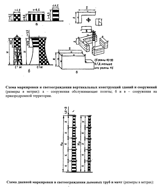 5.5.6. Объекты, подлежащие маркировке и имеющие практически сплошные поверхности, окрашиваются следующим образом: в шахматном порядке прямоугольниками (квадратами) со стороной 1,5-3,0 м, если проекции поверхностей объекта на любую вертикальную плоскость составляют или превышают 4,5 м в обоих измерениях, причем углы окрашиваются в темный цвет; чередующимися по цвету полосами шириной 0,5-3,0 м перпендикулярно большему измерению, если одна из сторон объекта в горизонтальном или вертикальном измерении составляет или более 1,5 м, а другая сторона составляет или менее 4,5 м, причем крайние полосы окрашиваются в темный цвет. 5.5.7. Объекты (трубы, теле- и метеомачты, опоры линий электропередач и др.): при высоте до 100 м должны маркироваться от верхней точки до линии пересечения с поверхностью ограничения препятствий, но не менее чем на 1/3 их высоты, чередующимися по цвету горизонтальными полосами шириной 0,5-6,0 м. Минимальное число чередующихся полос - три; при высоте более 100 м должны маркироваться от верха до основания чередующимися по цвету полосами. При нанесении маркировки*(11) руководствуются следующими соотношениями высоты объекта и ширины маркировочной полосы: