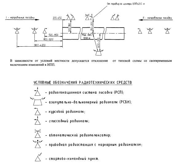 Рис. 6. Типовая схема размещения радиотехнических средств аэродромов экспериментальной авиации. Радиомаячные системы 6.2.3. Антенная система КРМ устанавливается на продолжении оси ВПП со стороны, противоположной направлению захода на посадку, а расстояние до конца ВПП должно обеспечивать безопасную высоту пролета над препятствиями. Боковое смещение антенны от продолжения осевой линии ВПП не допускается. 6.2.4. При совместной установке на аэродроме РМС метрового и дециметрового диапазонов, допускается установка антенны курса дециметрового радиомаяка со смещением ее центра вправо или влево от продолжения оси ВПП на расстояние до 22,5 м. При этом зазор между крайними точками антенн метрового и дециметрового диапазонов должен быть не менее 10 м при антенне метрового диапазона директорного типа и не менее 5 м при антенне метрового диапазона с параболическим отражателем. При смещении относительно оси ВПП антенна должна быть ориентирована таким образом, чтобы плоскость курса пересекала плоскость, содержащую ось данной ВПП, над точкой установки ближнего маркерного радиомаяка. 6.2.5. ГРМ должен устанавливаться во всех случаях, когда это возможно, со стороны, противоположной участку застройки аэродрома и рулежных дорожек. Дальность установки антенной системы ГРМ от начала ВПП выбирается с таким расчетом, чтобы спрямленная часть линии глиссады проходила через опорную точку (над началом ВПП) на высоте, обеспечивающей безопасный пролет ВС над препятствиями и безопасную посадку на ВПП. 6.2.6. Высота опорной точки должна быть как можно ближе к оптимальной величине (15+3/-0) м. В отдельных случаях допускается высота опорной точки (15+3/-3) м для ИЛС I категории. 6.2.7. Номинальный угол наклона глиссады должен устанавливаться в пределах от 2 до 4 градусов. Рекомендуется устанавливать номинальный угол наклона глиссады, равным 3 градусам. Угол наклона более 3 градусов может устанавливаться только тогда, когда окружающие условия исключают возможность установки угла 3 градуса. 6.2.8. В случае, если условия местности не удовлетворяют требованиям, приведенным в эксплуатационной документации, окончательное заключение о пригодности к эксплуатации РМС на данном аэродроме принимается лицом, утверждающим Акт летной проверки. Приводные радиостанции и маркерные радиомаяки 6.2.9. Антенные системы ближней, дальней приводных радиостанций и маркерных радиомаяков рекомендуется размещать на продолжении осевой линии ВПП, на удалениях от порога ВПП в соответствии с типовой схемой. В зависимости от условий местности допускается боковое смещение от продолжения осевой линии ВПП для БПРМ не более ±15 м, а для ДПРМ не более ±75 м. Высота антенных мачт БПРМ выбирается с учетом требований к ограничению высоты препятствий. На равнинной местности она может составлять от 6,5 до 10 м при размещении антенны на удалениях от начала ВПП 850 и 1200 м соответственно. Автоматический радиопеленгатор 6.2.10. Автоматический радиопеленгатор устанавливается в районе РСП, а на аэродромах, не оборудованных РМС - в районе ДПРМ с основным курсом посадки на удалении до ±500 м от него. Радиотехническая система ближней навигации 6.2.11. Геодезическая привязка производится согласно эксплуатационной документации РСБН в прямоугольных координатах (X, Y) с предельной ошибкой _10 м, в географических координатах (широ