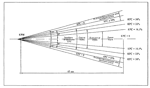 6.3.30. Пределы, в которых должна поддерживаться средняя линия курса относительно осевой линии ВПП у опорной точки должна быть не более: а) ±10,5 м для КРМ I категории; б) ±7,5 м для КРМ II категории; в) ±3,0 м для КРМ III категории. 6.3.31. Номинальная чувствительность к смещению от линии курса должна быть 0,00145 РГМ/м. Максимальный угол сектора курса не должен превышать 6 градусов. Пределы, в которых должна поддерживаться чувствительность к смещению КРМ (отклонение от номинального значения), не более: а) ±17% для КРМ I категории; б) ±17% для КРМ II категории (поддержание чувствительности осуществляется в пределах ±10% от номинального значения); в) ±10% для КРМ III категории. 6.3.32. Сигнал опознавания передается на несущей частоте КРМ и не должен влиять на основные функции курсового радиомаяка. 6.3.33. Сигнал опознавания передается международным кодом Морзе и состоять из трех букв. Первая буква "И", вторая и третья - код аэродрома или ВПП. 6.3.34. Автоматическая система контроля передает предупреждение в пункты управления и приводит или к прекращению излучения, или к снятию сигналов модуляции 90 и 150 Гц и составляющей опознавания с несущей частоты, или к переходу на более низкую категорию (для II и III категории) в течение времени, не более: 10 с для КРМ I категории; 5 с для КРМ II категории; 2 с для КРМ III категории; при возникновении любого из следующих условий: а) смещении средней линии курса относительно осевой линии ВПП, приведенное к порогу ВПП, более: ±10,5 м для КРМ I категории; ±7,5 м для КРМ II категории; ±6 м для КРМ III категории. б) уменьшении мощности излучения для КРМ с одной несущей до 50%; в) уменьшении мощности излучения для каждой несущей для КРМ II и III категорий с двумя несущими до 80%; г) изменение чувствительности к смещению более чем на 17% от номинальной величины. Под пунктами управления понимаются пункты управления работой оборудования и пункты управления воздушным движением.