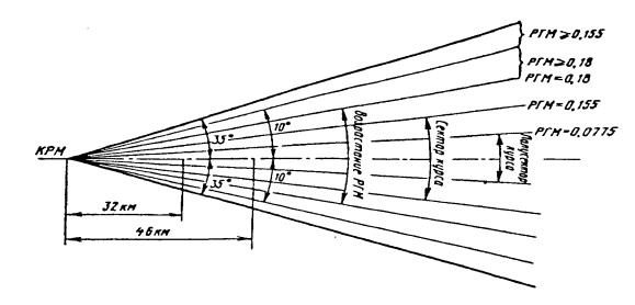 Рис. 6.9. Зона действия РД в вертикальной плоскости. Системы посадки метрового диапазона волн 6.3.19. В состав системы посадки должны входить: курсовой радиомаяк; глиссадный радиомаяк; маркерные радиомаяки - ближний (БМРМ) и дальний (ДМРМ); оборудование дистанционного управления и индикации технического состояния в пункте управления. Вместо ближнего или (и) дальнего маркерных радиомаяков допускается использование дальномерного оборудования ДМЕ/Н. 6.3.20. Параметры по резервированию и требования по маркировке критических зон аналогичны требованиям, содержащимся в пунктах 6.3.1.2-6.3.1.5 настоящих Норм. Курсовой радиомаяк, работающий по принципу ИЛС 6.3.21. Отклонение несущей частоты КРМ от присвоенной не должно превышать: ±0,005% для одночастотного маяка; ±0,002% для двухчастотного маяка. 6.3.22. Глубина модуляции несущих частот сигналами 90 и 150 Гц вдоль линии курса должна быть 20±2%. 6.3.23. Зона действия в горизонтальной плоскости должна быть ограничена секторами не менее 35 градусов вправо и влево от линии курса (рисунок 6.10). При использовании других средств, обеспечивающих вход ВС в зону действия КРМ, для КРМ I и II категорий допускается сужение зоны действия до _10 градусов в горизонтальной плоскости относительно линии курса.