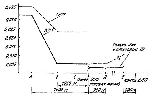 Рис. 6.11. Зона действия КРМ в вертикальной плоскости. 6.3.25. Зона действия КРМ по дальности (рисунок 6.11) со стороны захода на посадку на высоте 600 м и выше над порогом ВПП или 300 м над самой высокой точкой на промежуточном и конечном этапах захода на посадку (берется большее превышение над порогом ВПП) должна быть: а) не менее 46 км в пределах горизонтального сектора +10 градусов относительно линии курса; б) не менее 32 км в пределах горизонтального сектора от ±10 градусов до ±35 градусов относительно линии курса. Допускается уменьшение зоны действия КРМ по дальности вследствие ограничений по использованию воздушного пространства. Для КРМ с сектором действия ±10 градусов требования по дальности в секторах от ±10 градусов до ±35 градусов относительно линии курса не предъявляются. 6.3.26. Напряженность поля КРМ в любой точке зоны действия должна быть не менее 40 мкВ/м (-114 дБ Вт/м2), кроме того: а) в пределах сектора курса на глиссаде ИЛС на удалении 18 км от КРМ напряженность поля должна быть не менее 90 мкВ/м (-107 дБ Вт/м2) для КРМ категории I и 100 мкВ/м (-106 дБ Вт/м2) для КРМ категорий II и III; б) в точке, расположенной на высоте 15 м над порогом ВПП для КРМ II категории и 6 м для КРМ III категории напряженность поля возрастает до величины не менее 200 мкВ/м (-100 дБ Вт/м2); в) от точки, расположенной на высоте 6 м над порогом ВПП, до точки, расположенной на высоте 4 м над осевой линией ВПП на расстоянии 300 м от порога ВПП и далее на высоте 4 м вдоль ВПП в направлении КРМ напряженность поля КРМ III категории должна быть не менее 100 мкВ/м (-100 дБ Вт/м2). 6.3.27. Характер изменения РГМ в секторе: а) от линии курса до углов с РГМ = 0,180 должно быть монотонное (в основном линейное) увеличение РГМ; б) от углов с РГМ = 0,180 до углов ±10 градусов РГМ должна быть не менее 0,180; в) от углов ±10 градусов до углов ±35 градусов РГМ должна быть не менее 0,155. Примечание. Для КРМ с зоной действия ±10 градусов требования к характеру изменения РГМ за пределами зоны действия не предъявляются. 6.3.28. Искривления линии курса КРМ I категории (95% вероятности) должна быть не более, на участках: а) от границы зоны действия до точки А - 0,031 РГМ; б) от точки А до точки В (рисунок 6.12) уменьшается по линейному закону от величины 0,031 РГМ в точке А до величины 0,015 РГМ в точке В; в) от точки В до точки С - 0,015 РГМ. 6.3.29. Искривления линии курса КРМ II и III категории (95% вероятности) должна быть не более (рисунок 6.13) на участках: а) от границы зоны действия до точки А - 0,031 РГМ; б) от точки А до точки В уменьшается по линейному закону от величины 0,031 РГМ в точке А до величины 0,005 РГМ в точке В; в) от точки В до точки С - 0,005 РГМ; г) от точки С до опорной точки - 0,005 РГМ; для КРМ III категории: д) от опорной точки до точки Д - 0,005 РГМ; е) от точки Д до точки Е должна увеличиваться по линейному закону от 0,005 РГМ в точке Д до 0,01 РГМ в точке Е.
