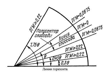 Глиссадный радиомаяк, работающий по принципу ИЛС 6.3.35. Отклонения несущей частоты ГРМ от присвоенной: ±0,005% - для одночастотного маяка; ±0,002% - для двухчастотного маяка. 6.3.36. Глубина модуляции несущих частот сигналами 90 и 150 Гц вдоль линии глиссады находится в пределах 40±2,5%. 6.3.37. Зона действия в горизонтальной плоскости (рисунок 6.14.) ограничивается сектором вправо и влево относительно линии курса, не менее 8 градусов. 6.3.38. Зона действия в вертикальной плоскости (рисунок 6.15.) ограничивается углами относительно горизонта: а) выше усредненного значения глиссады, не менее 1,75Q; б) ниже усредненного значения глиссады ГРМ, не менее 0,45Q, или до угла 0,30Q для обеспечения гарантированного входа в глиссаду.