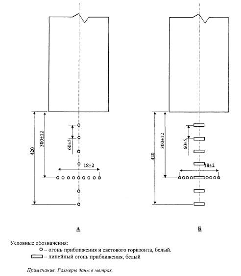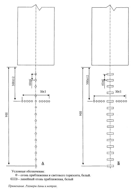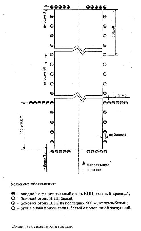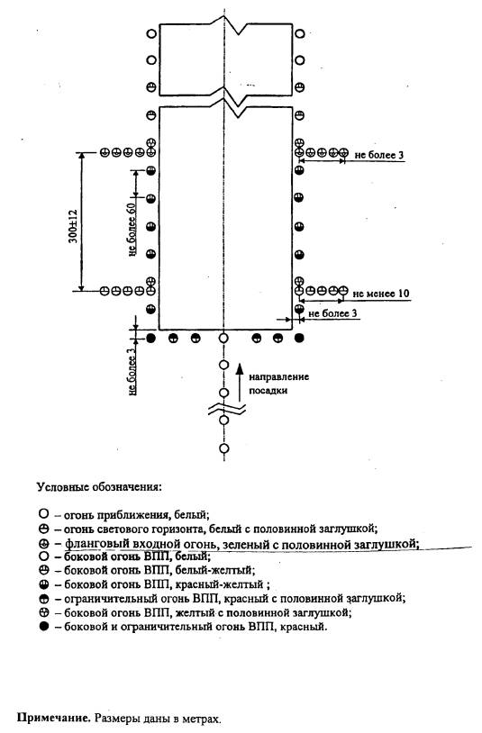 Рис. 7.2. Схемы расположения огней приближения системы ОМИ (вариант 2). 7.2.5. Огни, образующие центральный ряд, располагаются с продольным интервалом 60±5 м. Для улучшения ориентации можно использовать интервалы 30±3 м. Ближайший огонь располагается на расстоянии либо 60±5 м, либо 30±3 м от порога ВПП, в зависимости от интервала, установленного для огней центрального ряда. 7.2.6. Одиночные огни или середины линейных огней центрального ряда устанавливаются на продолжении осевой линии ВПП. 7.2.7. Световые горизонты и линейные огни размещаются перпендикулярно центральному ряду огней приближения. 7.2.8. В подсистеме огней приближения не допускается отсутствие более одного огня (одиночного или линейного) центрального ряда, а также огня, ближайшего к порогу ВПП. 7.2.9. Если ВПП имеет смещенный порог, огни приближения центрального ряда на участке между торцом ВПП и смещенным порогом могут не устанавливаться. При смещении порога более чем на 312 м световые горизонты устанавливаются на флангах ВПП и располагаются на расстоянии 300±12 м от порога ВПП. Внутренние огни таких горизонтов устанавливаются на продолжении линии боковых огней ВПП. Каждый горизонт имеет длину 10±1 м и состоит из пяти огней. 7.2.10. Огни в подсистеме огней приближения являются огнями белого цвета. 7.2.11. Каждый огонь центрального ряда состоит из: а) одиночного источника света; или б) линейного огня шириной 3 м¸4,5 м. Интервал между одиночными огнями в линейном огне не должен превышать 1,5 м. Боковые огни ВПП 7.2.12. Боковые огни ВПП устанавливаются по схемам, приведенным на рисунках 7.3 и 7.4. 7.2.13. Боковые огни располагаются вдоль всей длины ВПП двумя параллельными рядами на одинаковом удалении от осевой линии ВПП на расстоянии не более 3 м от края ВПП. 7.2.14. Боковые огни располагаются с одинаковыми интервалами не более 60 м. Огни, располагаемые по обе стороны от оси ВПП, находятся на линиях, проходящих под прямым углом к этой оси. На пересечениях ВПП, ВПП и РД и уширениях ВПП огни могут располагаться неравномерно или не устанавливаться вообще при условии, что расстояние между соседними боковыми огнями не будет превышать 180 м. 7.2.15. Боковые огни являются огнями белого цвета за исключением того, что: а) огни у конца ВПП на участке протяженностью 600 м или в одну треть длины ВПП, в зависимости от того, что меньше, являются огнями желтого цвета с излучением в направлении ВС, заходящего на посадку или взлетающего с ВПП; б) при наличии смещенного порога ВПП огни между началом ВПП и смещенным порогом являются огнями красного цвета с излучением в направлении ВС, заходящего на посадку. Огни уширений ВПП