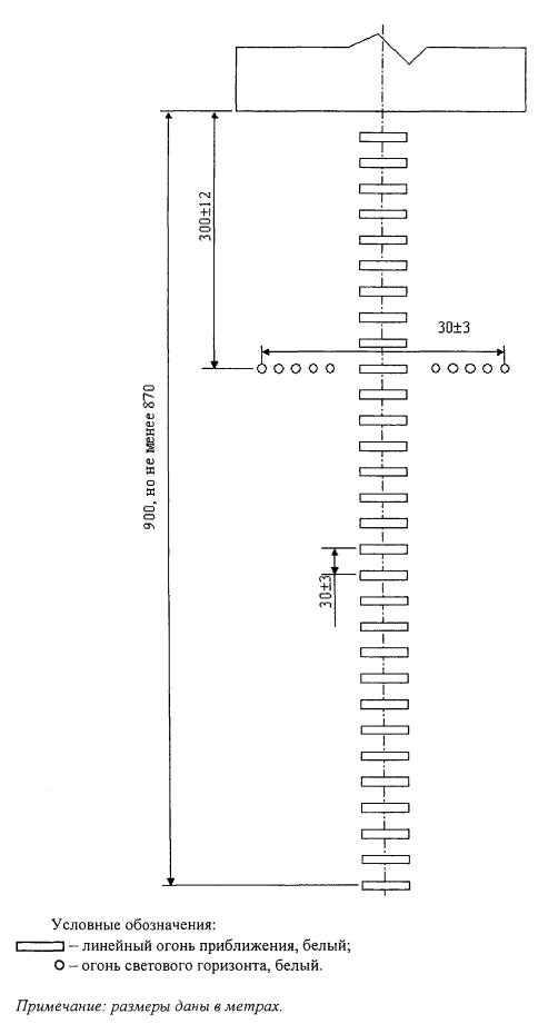 7.1.2. ВПП (направление) точного захода на посадку I категории должна быть оснащена системой светосигнального оборудования развернутого по схеме ССП-1 или ОВИ-1, II категории - системой ОВИ-2, III категории - системой ОВИ-3. 7.2. Система ОМИПодсистема огней приближения 7.2.1. Подсистемы огней приближения устанавливаются по схемам, приведенным на рисунках 7.1, 7.2 и 7.4. 7.2.2. Подсистема огней приближения состоит из ряда огней, установленных на продолжении осевой линии ВПП на протяжении до 900 м от порога ВПП, и ряда огней, образующих световой горизонт на расстоянии 300±12 м от порога ВПП шириной 18±2 м (при протяженности огней центрального ряда 420 м и менее) или 30±3 м (при протяженности огней центрального ряда более 420 м). Протяженность огней 900 м не означает ее предельной величины. 7.2.3. Если линия огней приближения короче 300 м, то огни центрального ряда должны представлять собой линейные огни шириной 3¸4,5 м. 7.2.4. Огни светового горизонта располагаются по горизонтальной прямой, перпендикулярной к линии огней центрального ряда, и таким образом, чтобы эта линия делила их пополам. Световой горизонт шириной 18 м должен состоять из 8 огней, шириной 30 м - из 10 огней. Интервалы между огнями светового горизонта должны быть равными. При ширине светового горизонта 30 м допускаются разрывы по обе стороны от продолжения осевой линии ВПП, не более 6 м каждый.