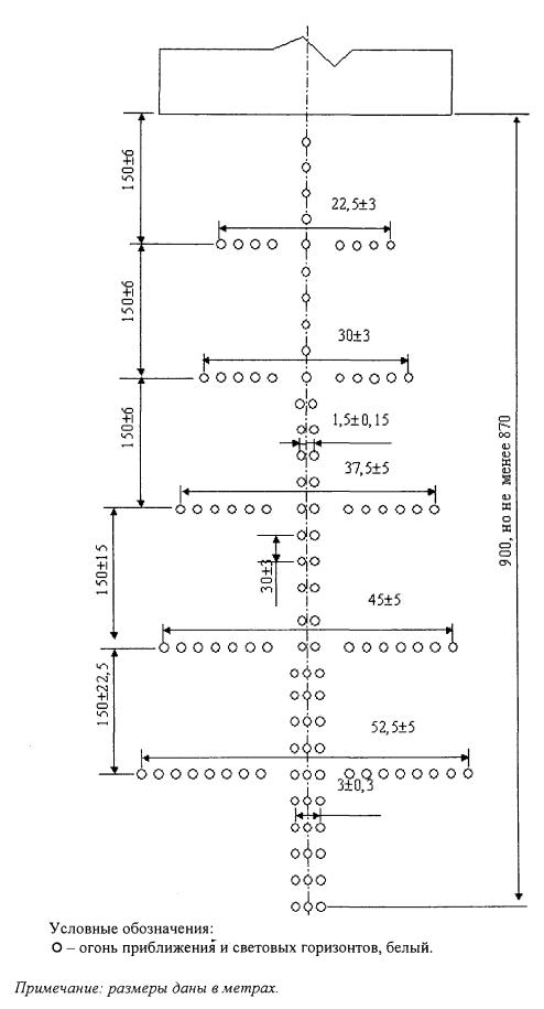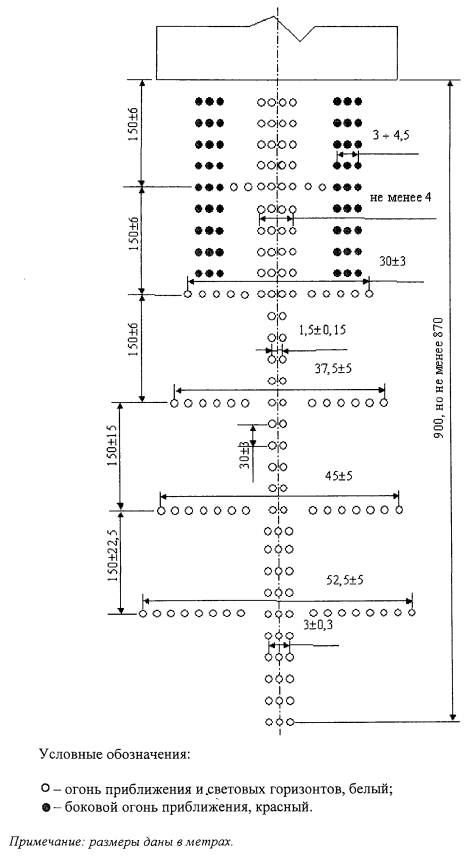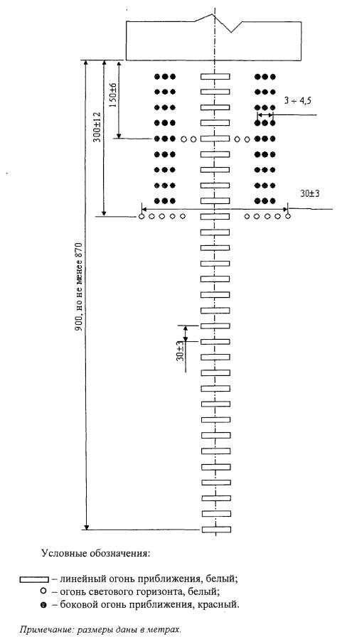 Рис. 7.6. Схема расположения огней приближения системы ОВИ-1 (с пятью световыми горизонтами). 7.3.4. Огни, образующие центральный ряд, располагаются с продольным интервалом в 30±3 м, при этом ближайший огонь располагается на расстоянии 30±3 м от порога ВПП. Продольный интервал между огнями центрального ряда устанавливается следующим образом: один огонь (или группа огней) располагался в центре каждого светового горизонта, а промежуточные огни центрального ряда располагаются, по возможности, равномерно между соседними световыми горизонтами или порогом ВПП. 7.3.5. Если осевая линия состоит из огней, указанных в подпункте "а" пункта 7.3.11, то дополнительно к световому горизонту, предусмотренному на расстоянии 300 м от порога ВПП, устанавливаются огни светового горизонта на расстоянии 150 м, 450 м, 600 м и 750 м от порога ВПП. Огни светового горизонта располагаются по горизонтальной прямой, перпендикулярной к линии огней центрального ряда, таким образом, чтобы эта линия делила их пополам. Интервалы между огнями светового горизонта должны быть равными. Допускаются разрывы по обе стороны от продолжения осевой линии ВПП, не более 6 м каждый. 7.3.6. Там, где в подсистему включены дополнительные световые горизонты, указанные в пункте 7.3.5, их внешние огни находятся на двух прямых линиях, сходящихся на осевой линии ВПП в точке, расположенной на расстоянии 300 м за порогом ВПП. 7.3.7. Одиночные огни, середины сдвоенных или линейных огней центрального ряда устанавливаются на продолжении осевой линии ВПП. 7.3.8. Световые горизонты и линейные огни располагаются перпендикулярно центральному ряду системы огней приближения. 7.3.9. В подсистеме огней приближения не допускается отсутствие более одного огня (одиночного или линейного) центрального ряда, при этом отсутствие огня, ближайшего к порогу ВПП, и огня в начале линии огней приближения не допускается. 7.3.10. На ВПП со смещенным порогом подсистема огней приближения устанавливается по таким же схемам, что и на ВПП, где порог совпадает с ее торцом. а) одиночного источника света на ближнем к ВПП участке осевой линии длиной 300 м, сдвоенных источников света - на среднем участке осевой линии длиной 300 м и строенных источников света - на дальнем участке осевой линии длиной 300 м; или б) линейного огня. 7.3.12. Длина линейного огня составляет не менее 4 м. Одиночные источники света (огни) в линейном огне располагаются с одинаковыми интервалами, не превышающими 1,5 м. 7.3.13. Если устанавливаются импульсные огни приближения, то они должны располагаться у каждого линейного огня приближения за пределами 300 м от порога ВПП и производить вспышки белого цвета в установленной последовательности в направлении от самого дальнего огня до самого ближнего к порогу ВПП огня. Боковые огни ВПП 7.3.14. Боковые огни ВПП устанавливаются по схемам, приведенным на рисунках 7.7 и 7.8. 7.3.15. Боковые огни располагаются вдоль всей длины ВПП двумя параллельными рядами на одинаковом удалении от осевой линии ВПП на расстоянии не более 3 м от края ВПП.