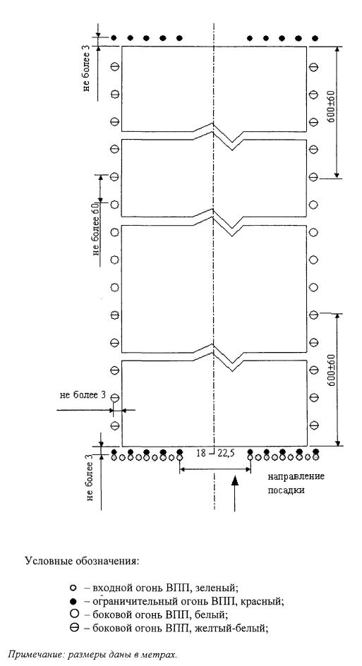 Рис. 7.8. Схема расположения системы ОВИ-1 при смещенном пороге ВПП. 7.3.16. Боковые огни располагаются с одинаковыми интервалами не более 60 м. Огни, располагаемые по обе стороны от оси ВПП, находятся на линиях, проходящих под прямым углом к ее оси. На пересечениях ВПП, ВПП и РД и уширениях ВПП боковые огни могут располагаться неравномерно или не устанавливаться вообще при условии, что: а) на ВПП установлены осевые огни ВПП; или б) расстояние между соседними боковыми огнями ВПП не будет превышать 120 м. 7.3.17. Боковые огни являются огнями белого цвета за исключением того, что: а) огни ВПП на участке протяженностью 600 м у конца являются огнями желтого цвета с излучением в направлении ВС, заходящего на посадку или взлетающего с ВПП; б) при наличии смещенного порога ВПП огни между началом ВПП и смещенным порогом являются огнями красного цвета с излучением в направлении ВС, заходящего на посадку. 7.3.18. Если в качестве боковых огней используются прожекторы, то они должны быть дополнены огнями кругового обзора. Огни уширений ВПП 7.3.19. Расположение и характеристики огней уширений ВПП должны соответствовать пунктам 7.2.16, 7.2.17. Входные огни ВПП и фланговые входные огни 7.3.20. Если порог совпадает с торцом ВПП, входные огни располагаются в ряд под прямым углом к оси ВПП, как можно ближе к торцу ВПП, и в любом случае не далее 3 м за его пределами. При этом крайние входные огни устанавливаются на продолжении линии посадочных огней (рисунок 7.7). 7.3.21. При наличии смещенного порога ВПП входные огни размещаются в ряд под прямым углом к оси ВПП у смещенного порога (рисунок 7.8). 7.3.22. Входные огни состоят, по крайней мере, из такого количества огней, которое окажется необходимым для того, чтобы они равномерно располагались между рядами боковых огней с интервалом в 3 м. 7.3.23. Входные огни должны быть: а) расположены с одинаковыми интервалами между рядами боковых огней; или б) расположены двумя группами симметрично осевой линии ВПП, при этом в каждой группе огни устанавливаются с одинаковыми интервалами и разрыв между этими группами должен равняться поперечному расстоянию между маркировочными знаками зоны приземления. Допускается разрыв между группами равный не более половины расстояния между рядами боковых огней ВПП. 7.3.24. Фланговые входные огни располагаются двумя группами, симметрично осевой линии, у порога ВПП. Каждая группа образуется, по крайней мере, пятью огнями, устанавливаемыми на линии длиной не менее 10 мс внешней стороны от линии боковых огней ВПП и под прямым углом к последней, при этом ближайший к ВПП огонь каждого светового горизонта находится на одной линии с боковыми огнями (рисунок 7.8). 7.3.25. Входные огни ВПП и фланговые входные огни являются однонаправленными огнями зеленого цвета с излучением в направлении ВС, заходящего на посадку. Ограничительные огни ВПП 7.3.26. Ограничительные огни ВПП располагаются на линии, перпендикулярной к оси ВПП, как можно ближе к торцу ВПП, и в любом случае не далее 3 м с внешней стороны от торца ВПП (рисунки 7.7 и 7.8). 7.3.27. Ограничительные огни должны состоять не менее, чем из шести огней, расположенных с одинаковыми интервалами между рядами боковых огней или двумя группами симметрично осевой линии ВПП, при этом в каждой группе огни устанавливаются с одинаковыми интервалами и разрыв между этими группами должен составлять не более 