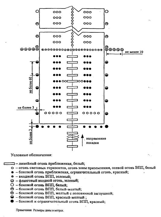 Рис. 7.10. Схема расположения огней приближения систем ОВИ-2 и ОВИ-3. Боковые огни ВПП 7.4.19. Боковые огни ВПП устанавливаются по схемам, приведенным на рисунках 7.11 и 7.12. 7.4.20. Боковые огни располагаются вдоль всей длины ВПП двумя параллельными рядами на одинаковом удалении от осевой линии ВПП на расстоянии не более 3 м от края ВПП. 7.4.21. Боковые огни располагаются с одинаковыми интервалами не более 60 м. Огни, располагаемые по обе стороны от оси ВПП, находятся на линиях, проходящих под прямым углом к этой оси. На пересечениях ВПП, ВПП и РД и уширениях ВПП огни могут располагаться неравномерно или не устанавливаться. 7.4.22. Боковые огни являются огнями белого цвета за исключением того, что: а) огни у конца ВПП на участке протяженностью 600 м или в одну треть длины ВПП, в зависимости от того, что меньше, являются огнями желтого цвета и излучают свет в направлении ВС, заходящего на посадку или взлетающего с ВПП; б) при наличии смещенного порога ВПП огни между началом ВПП и смещенным порогом являются огнями красного цвета с излучением в направлении ВС, заходящего на посадку. 7.4.23. Если в качестве боковых огней используются прожекторы, они должны быть дополнены огнями кругового обзора. Огни уширений ВПП 7.4.24. Расположение и характеристики огней уширений ВПП должны соответствовать пунктам 7.2.16, 7.2.17. Входные огни ВПП и фланговые входные огни 7.4.25. Если порог совпадает с торцом ВПП входные огни располагаются в ряд под прямым углом к оси ВПП, как можно ближе к торцу ВПП, во всех случаях не далее 3 м от него. При этом крайние входные огни устанавливаются на продолжении линии боковых огней ВПП (рисунок 7.11). 7.4.26. При наличии смещенного порога ВПП входные огни размещаются в ряд под прямым углом к оси ВПП у смещенного порога (рисунок 7.12). 7.4.27. Входные огни состоят из огней, равномерно расположенных между рядами боковых огней с интервалом не более 3 м. 7.4.28. Фланговые входные огни располагаются двумя группами, симметрично осевой линии, у порога ВПП. Каждая группа образуется, по крайней мере, пятью огнями, устанавливаемыми на линии длиной не менее 10 м с внешней стороны от линии боковых огней ВПП и под прямым углом к последней, при этом ближайший к ВПП огонь каждого светового горизонта находится на одной линии с боковыми огнями ВПП (рисунок 7.12).