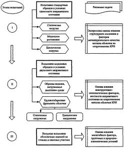 Рисунок 1 - Структурная схема исследования сопротивления металла и сварных соединений оболочечных изделий коррозионному растрескиванию под напряжением 5.2.1 Испытания сталей и сварных соединений на КРН осуществляют с применением стандартных образцов цилиндрической или плоской формы, используемых для испытаний на одноосное растяжение в соответствии с ГОСТ 1497, ГОСТ 6996, NACE Standard ТМ 0177-2005 [1]. 5.2.2 Отбор заготовок для изготовления стандартных образцов производят согласно ГОСТ 7564 из основного металла или сварных соединений. Заготовки из цилиндрических изделий вырезают вдоль оси цилиндра. Заготовки сварных соединений вырезают непосредственно из сварной конструкции или контрольных сварных соединений, выполненных согласно требованиям НД на сварную конструкцию. Размер заготовок сварных соединений определяют по ГОСТ 6996 и ISO 7539-8-2000 [5]. 5.2.3 При определении эффективности применяемых методов противокоррозионной защиты - ингибиторов или покрытий - технические требования к основному металлу и покрытиям должны соответствовать ГОСТ 9.506 и ГОСТ 9.301. Образцы изготавливают из сталей, идентичных материалу изделий, для защиты которых предназначен ингибитор или покрытие. Допускается применение образцов из сталей марки Ст 3 по ГОСТ 380 и марок 20, 35, 45 по ГОСТ 1050. 5.2.4 Зоны сварного соединения на стальных заготовках и образцах определяют визуально или с помощью травления макрошлифов 4 %-ным раствором азотной кислоты по ГОСТ 4461 в этиловом спирте по ГОСТ 18300 в течение 20 мин. Наличие дефектов сварных соединений выявляют по ГОСТ 3242. 5.2.5 Образцы из листового проката вырезают в направлении, перпендикулярном направлению проката, а из сварных соединений - перпендикулярно сварному шву так, чтобы одна из зон сплавления проходила на расстоянии от 2 до 6 мм от середины рабочей части образца, при этом рабочая часть образца должна включать металл шва, зону термического влияния и основной металл согласно Р 54-298-92 [6]. 5.2.6 Форма и размеры образцов для испытаний материалов на КРН должны соответствовать ГОСТ 1497, при этом для цилиндрических образцов в соответствии с рисунком А (приложение А) назначают размеры: диаметр рабочей части d0 = 6 мм; длина рабочей части l0= 30 мм; радиусы галтелей - 15 мм. При невозможности выполнения указанных размеров допускается применение образцов с размерами: d0 = 4 мм, l0 = 20 мм. 5.2.7 Шероховатость рабочей поверхности образцов по ГОСТ 2789 должна быть не более 0,80 мкм при испытаниях с постоянной нагрузкой и 0,25 мкм - при испытаниях медленным растяжением. Механическую обработку образцов проводят на режимах, исключающих перегрев и наклеп в рабочей области. За последние два прохода снимают не более 0,05 мм. Рабочую часть образцов шлифуют в продольном направлении. 5.2.8 Образцы маркируют клеймением или несмываемой краской вне рабочей части, обезжиривают органическими растворителями, например нитротолуолом, тетрахлорэтиленом или уайт-спиритом, и промывают этиловым спиртом, после чего разрешается брать их только за нерабочую часть. Для уменьшения поверхности металла, контактирующей с коррозионной средой, на нерабочую поверхность образца наносят изолирующее покрытие (например, клей БФ-2, "цапон-лак", эпоксидный или другие составы, не взаимодействующие с коррозионной средой). Количество одинаковых образцов должно быть не менее пяти на каждый уровень постоянной рас