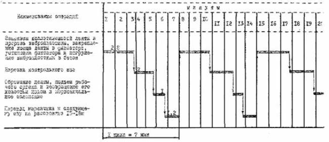 в цементобетонных дорожных покрытиях» III. Указания по организации трудаМодернизированный нарезчик швов ДНШС-60-3М обслуживают машинист нарезчика 4 разр. и бетонщик 4 разряда. Машинист нарезчика отвечает за качество устраиваемых швов. В процессе нарезки шва он управляет машиной, следит за работой рабочего органа и за хорошим сцеплением ленты с бетоном, а также заправляет ленту в прорезь вибропластины. В начале смены машинист готовит машину к работе, а в конце смены очищает ее от бетона. Бетонщик размечает швы (совместно с машинистом), заправляет конец ленты в фиксатор, устанавливает его и придерживает рукой при нарезке в начале шва, переходит по мостику машины и придерживает металлический щиток у кромки покрытия в конце шва в месте выхода вибропластины. Затем он обрезает ленту, очищает и убирает фиксатор и металлический щиток и заделывает бетон в начале и конце шва. Бетонщик периодически очищает и промывает водой вибропластину и резиновую гладилку. В начале и конце смены помогает машинисту в подготовке машины к работе, уборке рабочего места. Полиэтиленовую пленку разрезают на ленты заранее на специальном станке, сматывают в бухты и доставляют к месту работ. IV. Циклограмма нарезки контрольных швов модернизированным нарезчиком швов ДНШС-60-3М