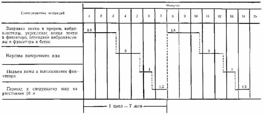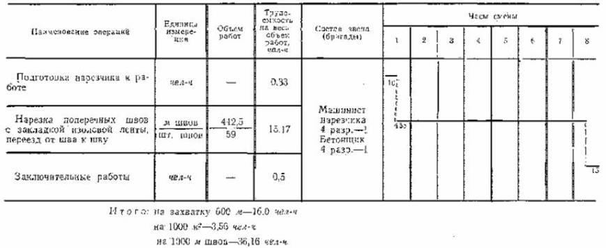 деформационных швов в цементобетонных дорожных покрытиях». III. УКАЗАНИЯ ПО ОРГАНИЗАЦИИ ТРУДАРаботы по нарезке швов в свежеуложенном бетоне, как правило, ведут в две смены. В каждую смену нарезчик швов ДНШС-60-3М обслуживает машинист нарезчика 4 разр. и бетонщик 4 разр. Машинист нарезчика отвечает за качество устраиваемых швов. Он управляет машиной, следит за работой рабочего органа и за хорошим сцеплением ленты с бетоном, а также заправляет ленту в прорезь вибропластины. В начале смены машинист готовит машину к работе, а в конце смены очищает ее. Бетонщик заправляет конец ленты в фиксатор и придерживает его рукой при нарезке в начале шва, в маячных рядах приставляет и придерживает металлический щиток к кромке покрытия в конце шва в месте выхода вибропластины, обрезает ленту и убирает фиксатор, очищает фиксатор от бетонной смеси и отделывает поверхность бетона в начале и конце шва, устраняет мелкие дефекты после нарезки шва. Бетонщик периодически очищает и промывает водой вибропластину и резиновую гладилку. В начале и в конце смены помогает машинисту в подготовке машины к работе, уборке рабочего места, а также нарезает полиэтиленовую пленку на ленты и скручивает в бухты. IV. ГРАФИК