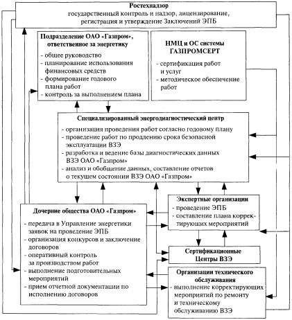Рисунок 5.1 - Схема взаимодействия участников процесса продления срока безопасной эксплуатации взрывозащищенного электрооборудования 5.4 Порядок проведения экспертизы промышленной безопасности для продления срока безопасной эксплуатации технических устройств, оборудования и сооружений на опасных производственных объектах определен в разделе IV ПБ 03-246-98 [3]. 5.5 Решение о продолжении эксплуатации ВЗЭ в пределах продленных сроков эксплуатации, его замене, ремонте принимаются руководителем эксплуатирующей организации. Решение не должно противоречить выводам экспертизы. 6 Порядок оценки состояния взрывозащищенного электрооборудования и принятия решений о продлении срока его службы6.1 Организация проведения экспертизы промышленной безопасности. 6.1.1 Экспертиза промышленной безопасности ВЗЭ производится в соответствии с программой, разработанной экспертной организацией и согласованной с эксплуатирующей организацией. При проведении экспертизы промышленной безопасности должны учитываться требования РД 03-484-02 [2], ПБ 03-246-98 [3], ПОТ РМ-16-2001 [5], ТИ РМ-074-2002 [6], РД 03-444-02 [7], ПБ 08-624-03 [8], РД 16.407-2000 [9] и Положения [10] на проведение диагностических, ремонтных, испытательных работ. 6.1.2 Для проведения работ по экспертизе промышленной безопасности эксплуатирующей организацией назначаются лица, ответственные за подготовку взрывозащищенного электрооборудования к техническому диагностированию и организацию мероприятий по безопасному ведению этих работ. 6.1.3 Ответственное лицо организации, эксплуатирующей ВЗЭ, назначается из числа инженерно-технических работников административно-технического персонала (с группой по электробезопасности не ниже V) или оперативного персонала (с группой по электробезопасности не ниже IV), имеющих допуск к работе с объектом диагностирования, право допускать к проведению работ или непосредственно производить работы по наряду, выполнять оперативные переключения. В обязанности этого лица входит подготовка технической документации, проведение инструктажа командированного персонала (персонала экспертной организации), оформление состава исполнителей, выдача нарядов на производство работ, оформление пропусков к объекту экспертизы. 6.1.4 Персонал организации, проводящей работы по техническому диагностированию, является командированным и на него распространяется порядок допуска к работам в соответствии с требованиями РД 03-444-02 [7]. 6.1.5 Организация, эксплуатирующая ВЗЭ, должна обеспечить командированный персонал электрозащитными средствами. 6.1.6 Организация, проводящая работы по техническому диагностированию, лицом, ответственным за производство работ, назначает инженерно-технического работника с группой по электробезопасности не ниже IV. 6.1.7 Организация, эксплуатирующая ВЗЭ, обязана обеспечить возможность проведения оперативного (функционального) диагностирования ВЗЭ в условиях нормального режима эксплуатации (в рабочем режиме) и в отключенном состоянии для проведения экспертизы промышленной безопасности. 6.1.8 Командированный персонал должен пройти инструктажи по электробезопасности и схеме электроснабжения электроустановки, а также должен быть ознакомлен с электрической схемой и особенностями электроустановки. Содержание инструктажа должно определяться инструктирующим работником в зависимост