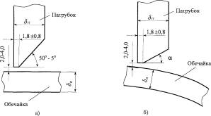 а) вид в продольном сечении основной трубы; б) вид в поперечном сечении основной трубы. Рисунок 6.3 - Форма разделки кромок сварного шва приварки патрубка к обечайке