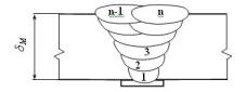 6.8.1.13 Сварку выполняют обратноступенчатым способом в последовательности, представленной на рисунке 6.5. 6.8.1.14 Во время сварки корневого слоя шва вышлифовывают начало и конец каждой прихватки. После сварки корневого шва выполнить подварку изнутри по всему периметру стыка. 6.8.1.15 Выполнить сварку заполняющих и облицовочного слоев. По завершении каждого прохода производят зачистку поверхности и вышлифовывают зашлакованные "карманы". Схема заполнения разделки сварного шва приведена на рисунке 6.6. Минимальное количество проходов должно соответствовать таблице 6.5. Минимальное количество проходов для выполнения слоев шва приварки патрубка к обечайке, включая корневой и подварочный