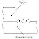 6.8.3.16 После сварки выводные планки с наплавленным на них металлом удаляют с помощью шлифовальной машины. Завершенные швы и прилегающую поверхность муфты зачищают от шлака и брызг. 6.8.3.17 После зачистки выполняют визуальный и измерительный контроль качества сварного соединения. 6.8.4 Сварка стыков "муфта - основная труба" (кольцевой угловой шов) 6.8.4.1 Перед началом сварки на стыки устанавливают электрические подогреватели (в случае использования). 6.8.4.2 Провести предварительный и сопутствующий подогрев кромок. 6.8.4.3 Перед началом сварки выполняют просушку поверхности основной трубы на участке приварки муфты. 6.8.4.4 Каждый шов варится двумя сварщиками одновременно. Режимы сварки приведены в таблице 6.8. 6.8.4.5 Для компенсации зазора между муфтой и основной трубой, а так же для создания благоприятных условий для формирования корневого слоя шва, сварку стыка начинают с выполнения наплавочного слоя шва (рисунок 6.9). Сварку наплавочного слоя выполняют "снизу-вверх". Сварку наплавочного слоя выполняют за два прохода. Таблица 6.8 Режимы сварки швов приварки муфты к основной трубе