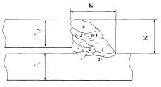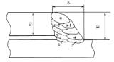 Kmin = δМ мм Kmax = δМ + 3,0 мм Рисунок 6.11 - Последовательность выполнения проходов сварного шва "муфта - основная труба" 6.8.4.11 После окончания сварки необходимо зачистить шов и прилегающую поверхность усиливающего элемента и основной трубы от шлака и брызг. 6.8.4.12 Произвести визуальный и измерительный контроль качества выполненных сварных соединений. 6.8.5 Сварка стыка "патрубок - днище / удлинительное кольцо" 6.8.5.1 Сборку стыка следует осуществлять с помощью наружного центратора или центрирующих приспособлений. 6.8.5.2 Технологический зазор в собранном стыке должен составлять от 2 до 3 мм, при этом внутреннее смещение кромок не должно превышать 2 мм. Допускаются локальные смещения кромок до 3 мм на длине не более 1/6 периметра стыка. 6.8.5.3 При сборке стыка диаметром 530/720 мм расстояние между продольными заводскими швами стыкуемых элементов должно быть не менее 100 мм. 6.8.5.4 Провести предварительный и сопутствующий подогрев. 6.8.5.5 Свариваемый стык должен быть собран с помощью прихваток, равномерно распределенных по периметру стыка. Количество прихваток должно быть не менее трех длиной не менее 60 мм каждая. 6.8.5.6 Сварку корневого слоя шва выполняют двумя сварщиками одновременно "снизу-вверх". Каждый сварщик выполняет свой полупериметр стыка, расположенный симметрично относительно вертикальной плоскости, проходящей через ось патрубка. Режимы сварки приведены в таблице 6.10. В процессе сварки корневого слоя шва необходимо вышлифовать начало и концы прихваток. 6.8.5.7 Наружный центратор или центрирующее приспособление разрешается снимать после выполнения корневого слоя на 60 % периметра трубы. 6.8.5.8 В случае приварки фланца выполнить подварку изнутри по всему периметру стыка. 6.8.5.9 Сварку заполняющих и облицовочного слоев шва выполняют двумя сварщиками одновременно "снизу-вверх", на режимах, приведенных в таблице 6.10. Каждый сварщик выполняет свой полупериметр стыка, расположенный относительно вертикальной плоскости, проходящей через ось патрубка. Минимальное количество проходов шва приведено в таблице 6.11. После выполнения каждого прохода шов должен быть зачищен механическим способом с целью удаления шлака, брызг и "карманов". 6.8.5.10 Ширина валика, выполняемого за один проход, не должна превышать 15 мм. 6.8.5.11 Сварка заполняющих и облицовочного слоев шва, выполняемых за несколько проходов, производится валиками с взаимным перекрытием не менее 2 мм. Таблица 6.10 Режимы сварки стыковых швов "патрубок - днище", "патрубок - удлинительное кольцо"