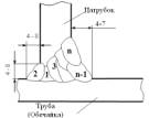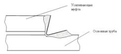 Рисунок 6.15 - Схема разделки кромок под ремонт дефекта, расположенного в угловом шве нахлесточного сварного соединения "усиливающая муфта - основная труба 6.10.1.7 При выборке внутренних дефектов снаружи трубы ширина раскрытия "новых" кромок должна быть на 2-4 мм меньше ширины облицовочного слоя. 6.10.1.8 При ремонте необходимо проводить просушку или предварительный подогрев, а также сопутствующий подогрев ремонтного участка. 6.10.1.9 Для ремонта корневого слоя шва применяют электроды типа Э50А (Е7016) диаметром от 2,5 до 2,6 мм. 6.10.1.10 Для ремонта заполняющих и облицовочного слоев шва применяют электроды типа Э50А (Е7016) диаметром от 2,5 до 3,2 мм. 6.10.1.11 Высота (толщина) каждого слоя при заварке дефектного участка не должна превышать 3,0 мм. 6.10.1.12 Ремонт подрезов в облицовочном слое шва или недостаточного перекрытия кромок трубы облицовочным слоем следует выполнять ниточными швами. При этом допустимое увеличение ширины облицовочного слоя в зоне ремонта не должно превышать 2,0 мм в сравнении с нормируемыми габаритами шва. 6.10.1.13 Ремонт дефектного участка разными сварщиками не допускается. Ремонт должен быть выполнен полностью без перерывов. 6.12.2 Ремонт сварных соединений чопов 6.10.1.1 Ремонт сварных швов чопов производится в соответствии с операционными технологическими картами ремонта (приложение Б). 6.10.1.2 Дефекты, обнаруживаемые визуально в процессе сварки, удаляют с помощью шлифования и последующей заварки. 6.10.1.3 При ремонте должна соблюдаться следующая последовательность технологических операций: - по результатам неразрушающего контроля определяют тип дефекта и отмечают его местоположение; - разметку дефектного участка под вышлифовку производит непосредственно бригадир звена сварочных работ. Длина участка вышлифовки должна превышать фактическую длину наружного или внутреннего дефектов не менее, чем на 1-3 мм в каждую сторону; - глубина выборки должна обеспечивать полное удаление дефекта; - во всех случаях выборка дефектных участков осуществляется только с помощью шлифовальных кругов; - мастер, руководящий ремонтными работами, должен лично убедиться, что в процессе шлифовки все обнаруженные дефекты вскрыты и удалены. 6.10.1.4 При ремонте необходимо проводить просушку ремонтного участка. 6.10.1.5 Для ремонта применяют электроды типа Э50А (Е7016) диаметром от 2,6 до 3,2 мм. Сварку электродами 2,6 мм ведут на токе от 70 до 90 А обратной полярности. Сварку электродами от 3,0 до 3,2 мм ведут на токе от 90 до 120 А обратной полярности. 6.10.1.6 Заполнение глубокой выборки проводят послойным наложением сварочных валиков. Высота (толщина) каждого слоя при заварке дефектного участка не должна превышать 3,0 мм. 6.10.1.7 Наложение ремонтных валиков при исправлении шва приварки гладких чопов диаметром от 8 до 12 мм должно начинаться и заканчиваться на технологических пластинах. Прихватки должны быть полностью переварены при сварке ремонтного шва. 6.10.1.8 Ремонт подрезов в облицовочном слое углового шва следует выполнять ниточными швами. Увеличение ширины облицовочного слоя в зоне ремонта не должно превышать 2,0 мм в сравнении с нормируемыми габаритами шва. 6.11 Аттестация сварщиков и технологии сварки 6.11.1 Сварщики, допускаемые к выполнению монтажных сварных соединений, должны быть аттестованы в соответствии с требованиями ПБ 03-273-99, РД 03-495-02, РД-08.00-60.30.00-КТН-050-1-05, ОР-07.00-45.25.40-КТН-001-2-01 и ознак