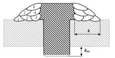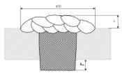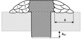 Рисунок 6.12 - Сборка и сварка гладких чопов диаметром от 8 до 12 мм. 6.9.1.14 После завершения сварки делают два поперечных надпила сварного шва до поверхности основного металла на расстоянии 15 мм в обе стороны от центра чопа и удаляют технологические пластины. С помощью шлифовальной машины сварному шву придают форму усеченного конуса с параметрами, указанными на рисунке А.3 (приложение А). Переходы между поверхностями конуса, конуса и основной трубы должны быть гладкими. Поверхность основной трубы вокруг чопа зачищают от металлических брызг. 6.9.1.15 После зачистки поверхности проводят визуальный и измерительный контроль, ультразвуковую и капиллярную дефектоскопию сварного соединения. 6.9.2 Сборка и сварка гладких чопов диаметром от 15 до 40 мм 6.9.2.1 Чоп устанавливают с помощью удлинительного приспособления (приложение А, рисунок А.6) и забивают молотком в отверстие на глубину S, предусмотренную таблицей 5.3. 6.9.2.2 Выступающая часть чопа и основная труба на расстоянии 50 мм от него должны быть зачищены до металлического блеска. 6.9.2.3 Сварку допускается проводить только после герметизации всех близкорасположенных отверстий. 6.9.2.4 Перед сваркой проводят просушку места сварки до (50 +20) °C. 6.9.2.5 Сварку ведут без перерывов электродами типа Э50А (Е7016) диаметром от 3,0 до 3,2 мм на токе от 90 до 120 А обратной полярности. 6.9.2.6 Первый сварщик полностью наплавляет первый слой по схеме "улитки" на головку чопа, не прерывая дугу, одним электродом в соответствии с рисунком А.4 (приложение А). 6.9.2.7 Не обрывая дуги, тем же электродом первый сварщик переходит на сварку корневого валика углового шва согласно рисунку А.4 (приложение А). 6.9.2.8 Одновременно второй сварщик начинает сварку корневого валика углового шва в том же направлении в противоположной точке относительно центра чопа согласно рисунку А.4 (приложение А). 6.9.2.9 Первый слой углового шва формируют одновременно два сварщика. Каждый сварщик выполняет половину валика с перекрытием 6-10 мм начального участка соседа. Каждый новый валик в слое располагают на окружности большего радиуса. Ширина валика должна составлять от 6 до 10 мм, межваликовое перекрытие - от 2 до 6 мм. 6.9.2.10 Точки начала и конца валиков следующего слоя должны быть смещены относительно начала и конца валиков предыдущего слоя на угол 90°. 6.9.2.11 После сварки каждого валика углового шва удаляют шлак с поверхности шва и вышлифовывают "зашлакованные карманы". 6.9.2.12 В результате сварки должен быть сформирован угловой шов с горизонтальным катетом k, соответствующим таблице 5.3 рисунку А.4 (приложение А). Угловой шов должен быть сварен в 3 или 4 слоя без учета первого наплавочного. 6.9.2.13 После завершения сварки первый слой удаляют шлифованием, угловой сварной шов и поверхность основной трубы вокруг чопа зачищают от металлических брызг. 6.9.2.14 После зачистки поверхности проводят ВИК, капиллярную дефектоскопию и УЗК сварного соединения. 6.9.3 Сборка и сварка резьбовых чопов 6.9.3.1 Резьбовые чопы заворачивают в отверстие и затягивают динамометрическим ключом до максимального момента М, указанного в таблице 5.4. Для уплотнения резьбы применяют асбестовый шнур ШАОН или сантехническую паклю. 6.9.3.2 Шестигранная головка чопа и основная труба на расстоянии 50 мм от него должны быть зачищены до металлического блеска. 6.9.3.3 Сварку допускается проводить только после герметизации всех б