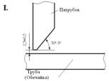 1 - участки патрубка с разделкой кромок (50-5)° 2 - участки патрубка с разделкой кромок а 3 - участки патрубка с разделкой кромок с переменным углом: от а до (50-5)° Рисунок 6.4 - Подготовка разделки кромок патрубка под сварное соединение 6.8 Изготовление, сборка и сварка разрезного тройника заводского исполнения 6.8.1 Последовательность изготовления разрезного тройника в заводских условиях 6.8.1.1 Изготовление разрезного тройника выполняют в следующей последовательности: - вальцовка и сварка обечайки; - визуальный и измерительный контроль стыкового шва обечайки; - подготовка патрубка ответвления / патрубка вантуза; - выбор и разметка места на обечайке под приварку патрубка; - установка патрубка на обечайку и выполнение сварного шва; - предварительный и сопутствующий (в процессе сварки) подогрев свариваемых кромок соединения "патрубок - обечайка"; - визуальный и измерительный контроль, неразрушающий контроль ультразвуковым и рентгенографическим методом углового кольцевого шва "патрубок - обечайка"; - выполнение термообработки сваренного изделия по режиму высокого отпуска; - неразрушающий контроль ультразвуковым методом углового кольцевого шва "патрубок - обечайка"; - разрезка обечайки, прорезка отверстия и подготовка кромок полумуфты разрезного тройника под сварку. 6.8.1.2 Для подготовки патрубка разрезного тройника используют разделки кромок, приведенные на рисунках 6.3 и 6.4. 6.8.1.3 Для изготовления полумуфт вальцуют и сваривают продольным швом обечайку. Листовой прокат, используемый для изготовления обечайки, не должен иметь расслоений и недопустимых поверхностных дефектов. 6.8.1.4 Сборку и сварку выполняют с использованием операционно-технологической карты (приложение Б). 6.8.1.5 Перед началом сборки необходимо выполнить разметку места установки патрубка на обечайке. Место установки выбирают таким образом, чтобы после разрезки обечайки на полумуфте с приваренным патрубком отсутствовал продольный сварной шов. 6.8.1.6 Все операции по сборке и сварке патрубка с обечайкой выполняются в нижнем положении при вертикальной ориентации оси патрубка. 6.8.1.7 Патрубок устанавливают седловидным торцом на обечайку с зазором от 2 до 3 мм. Для установки зазора в соединении "патрубок - обечайка" используют калибр или электродную проволоку соответствующего диаметра. 6.8.1.8 Правильность сборки контролируют с помощью уровня, угольника и линейки. 6.8.1.9 В процессе сборки должны быть обеспечены следующие параметры: - отклонение от перпендикулярности патрубка и обечайки, измеренное по образующей обечайки и поверхностью патрубка, должно быть не более 1°; - отклонение патрубка от вертикали должно быть не более 1°; - смещение патрубка относительно размеченного контура не должно превышать 3 мм. 6.8.1.10 Перед сваркой корневого слоя выполняют подогрев стыка. 6.8.1.11 После контроля температуры выполняют сварку прихваток по режиму сварки корневого слоя, равномерно распределив их по периметру патрубка. Количество прихваток - не менее четырех. Длина каждой прихватки должна быть не менее 60 мм. После выполнения прихваток калибр или проволока должны быть удалены из зазора. 6.8.1.12 Сварку стыка выполняют одновременно двумя сварщиками. Режимы ручной дуговой сварки стыка приведены в таблице 6.4. Таблица 6.4 Режимы сварки шва приварки патрубка к обечайке