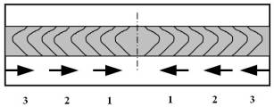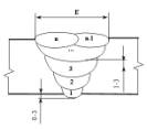 Рисунок 6.8 - Схема заполнения разделки продольного сварного шва полумуфт 6.8.3.15 Облицовочный слой должен иметь мелкочешуйчатую поверхность с глубиной волны не более 1,0 мм. Высота усиления сварного шва должна составлять от 1,0 до 3,0 мм. Усиление должно иметь плавный переход к основному металлу и перекрытие от 1,5 до 2,5 мм в каждую сторону. Минимальное количество проходов при сварке продольного стыкового шва