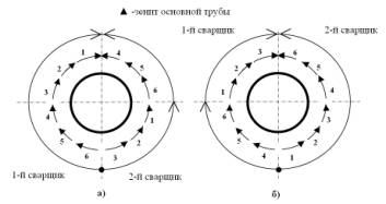 6.8.4.6 Сварку корневого и заполняющего валиков выполняют обратноступенчатым методом "снизу-вверх" по схеме, приведенной на рисунке 6.10.