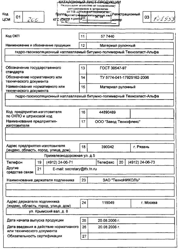 1.3.5 Техноэласт-Альфа должен быть гибким. При испытании на брусе с закруглением радиусом (25,0 ±0,2) мм при температуре не выше минус 20°С на лицевой поверхности образца не должно появляться трещин. 1.3.6 Техноэласт-Альфа должен быть водонепроницаемым. При испытании Техноэласта-Альфа при давлении не менее 0,2 МПа в течение не менее 2 ч на поверхности образца не должно быть признаков проникания воды. 1.3.7 Техноэласт-Альфа должен быть теплостойким. При испытании при температуре (100±2) °С в течение (2,0±0,1) ч на поверхности образца не должно быть вздутий и других дефектов вяжущего. 1.4 Упаковка 1.4.1 Техноэласт-Альфа поставляют в рулонах, обмотанных в двух или трех местах полимерной упаковочной лентой с липким слоем. Для обеспечения сохранности материала при транспортировании и хранении допускается установка в рулон картонной втулки, длина которой должна быть равна ширине полотна Техноэласта-Альфа с допускаемыми отклонениями (плюс 10, минус 100) мм. Допускается использование дополнительных упаковочных материалов, обеспечивающих сохранность продукции при транспортировании и хранении. 1.4.2 Рулоны Техноэласта-Альфа размещают на поддонах, скрепляют полимерной лентой и упаковывают в колпак из полимерной термоусадочной пленки. 1.5 Маркировка 1.5.1 Маркировка Техноэласта-Альфа должна производиться по ГОСТ 30547-97 со следующим дополнением: допускается вместо номера партии использовать другое обозначение партии, принятое на заводе-изготовителе. По согласованию с потребителем допускается изменение перечня указаний на этикетке. Допускается дополнительно наносить на этикетку или штамп справочные данные о продукции, представляющие интерес для потребителя. 1.5.2 Транспортная маркировка по ГОСТ 14192-96 с нанесением основных, дополнительных и информационных надписей. 2 ТРЕБОВАНИЯ БЕЗОПАСНОСТИ И ОХРАНЫ ОКРУЖАЮЩЕЙ СРЕДЫ2.1 Техноэласт-Альфа имеет следующие показатели пожарной опасности: - группа горючести - Г4 по ГОСТ 30244-94; - группа воспламеняемости - В3 по ГОСТ 30402-96; 2.2 При производстве Техноэласта-Альфа применяются нефтяные кровельные битумы, бутадиенстирольный термоэластопласт или его модификации, пылевидные наполнители (тальк, талькомагнезит, доломит), мелкозернистая посыпка (песок), стекловолокнистая или полиэфирная основа, фольга, полимерная пленка. 2.3 Нефтяные кровельные битумы являются горючими веществами с температурой вспышки не ниже 240 °С. Минимальная температура самовоспламенения 300 °С. 2.5 Токсикологическая характеристика компонентов, применяемых при изготовлении Техноэласта-Альфа, приведена в таблице 2.1. Таблица 2.1